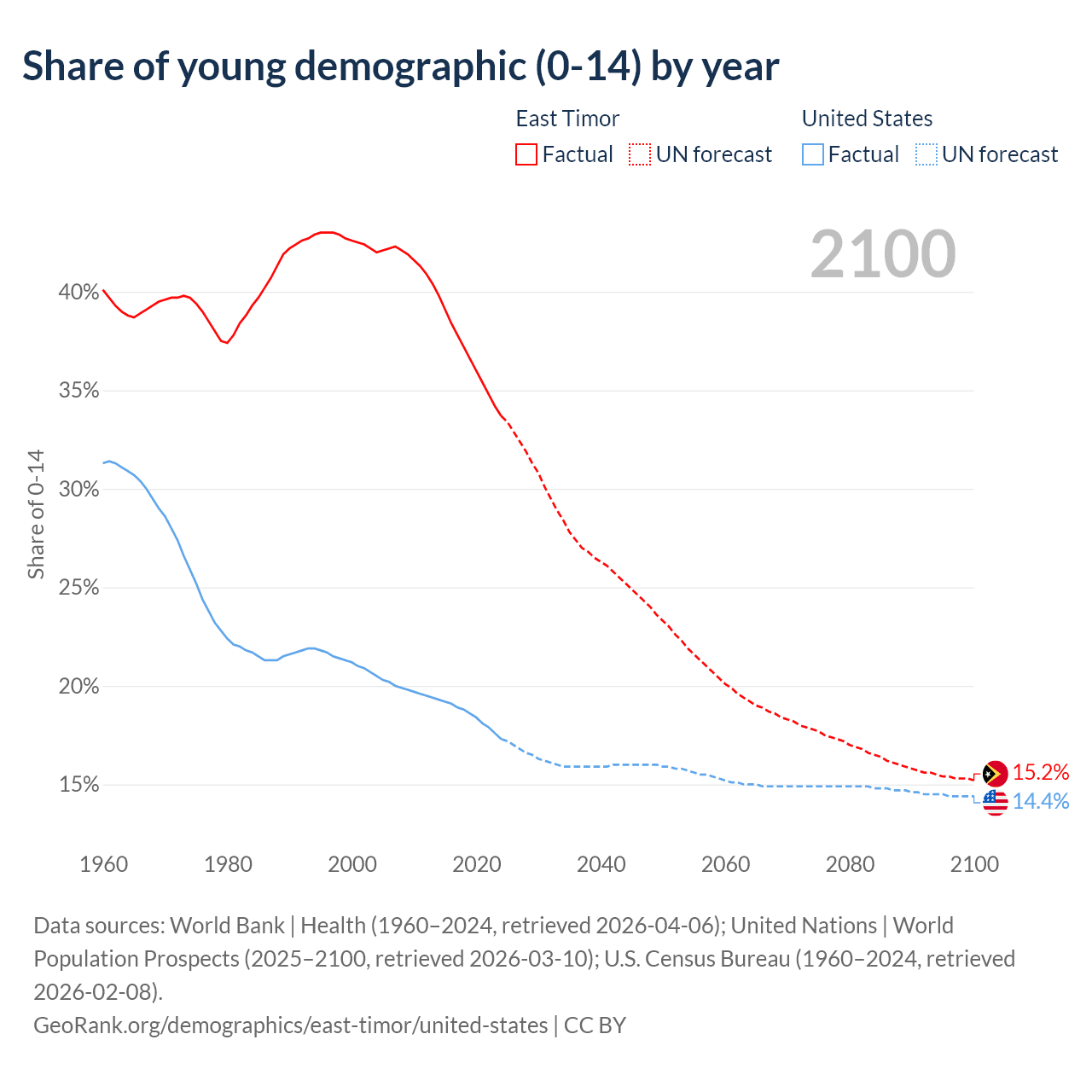 - The share of young demographic (0-15 years old) in East Timor is 33.7% vs 17.3% in the United States.