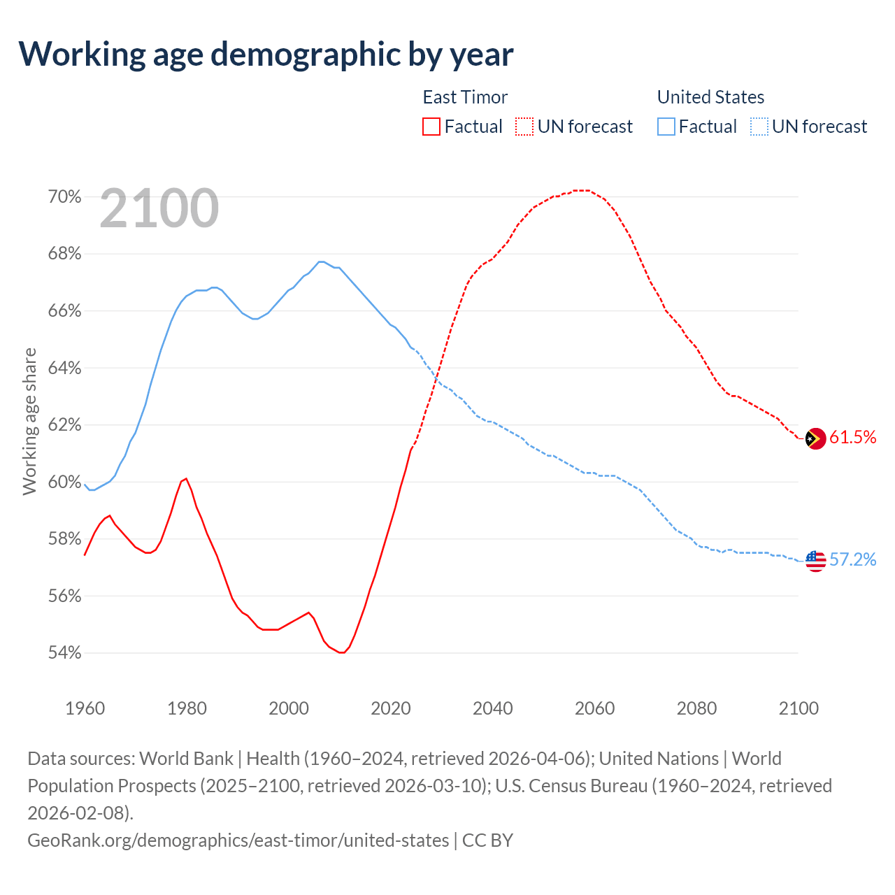 Median age East Timor vs United States, 1960-2100