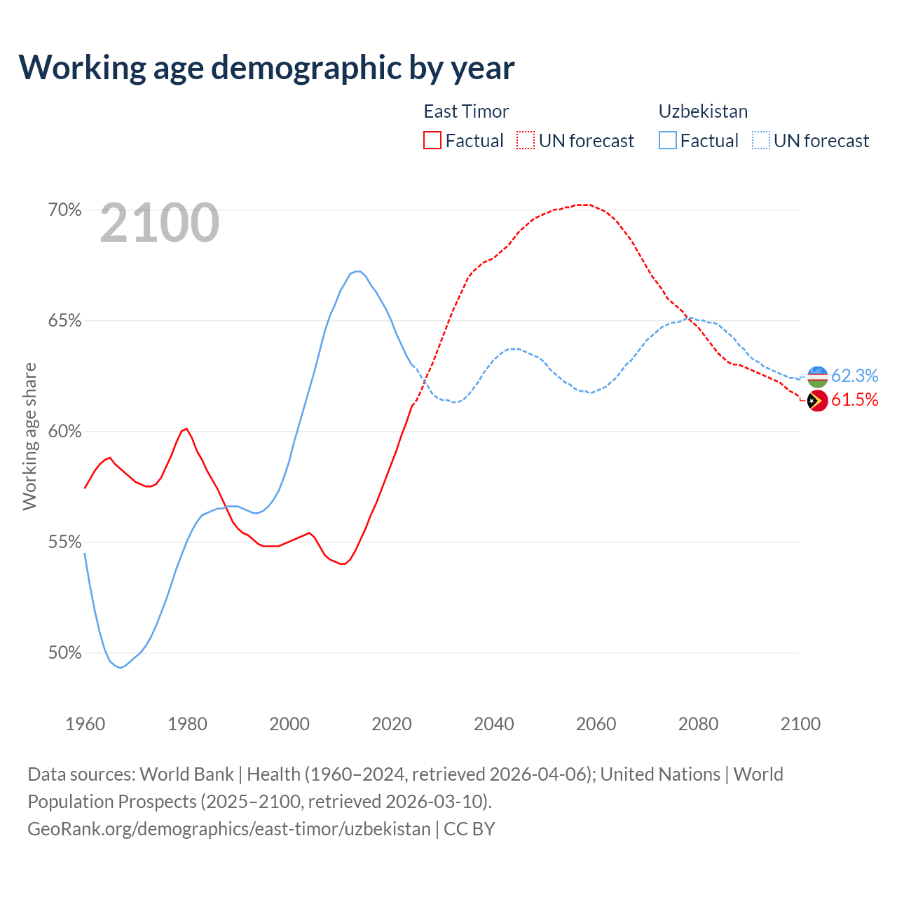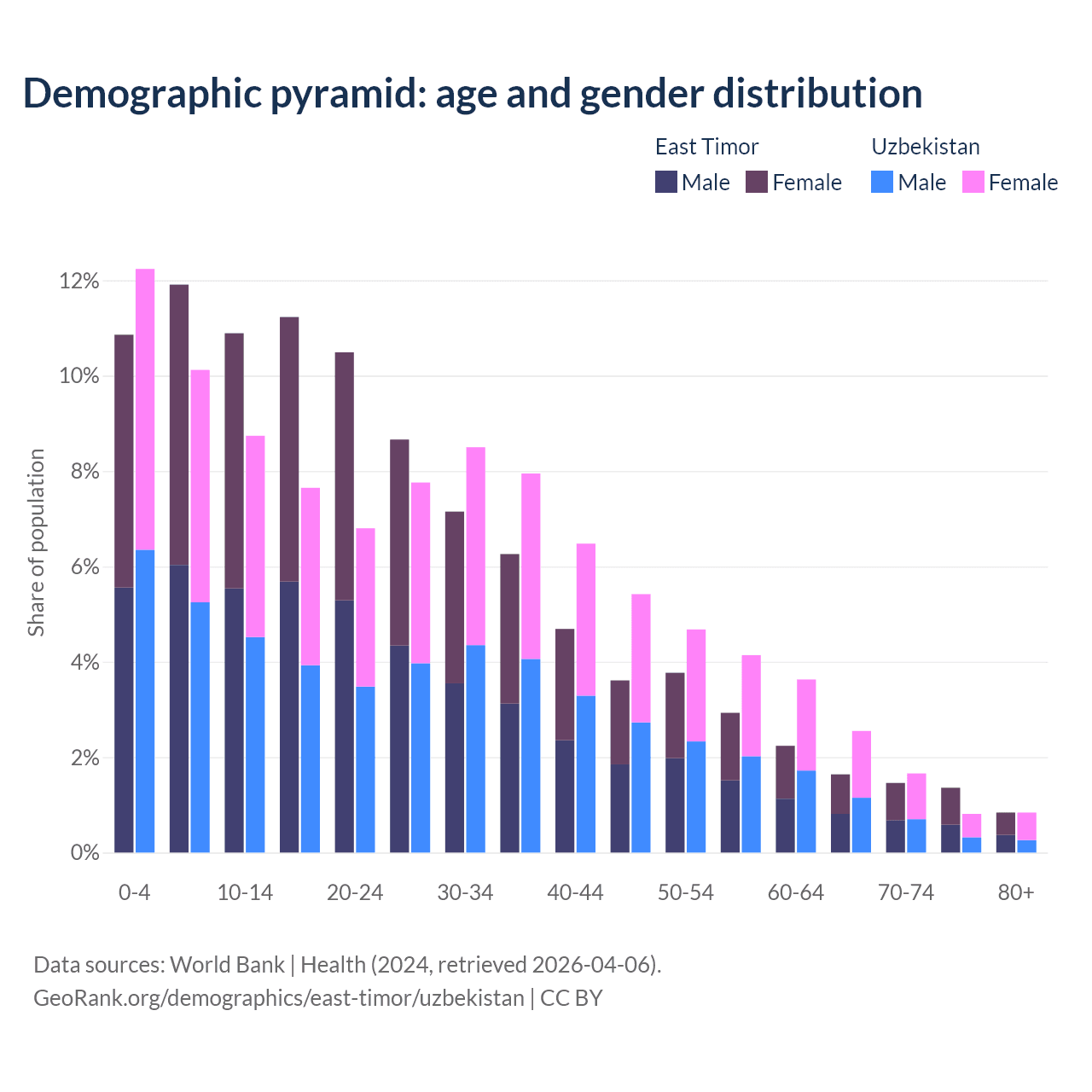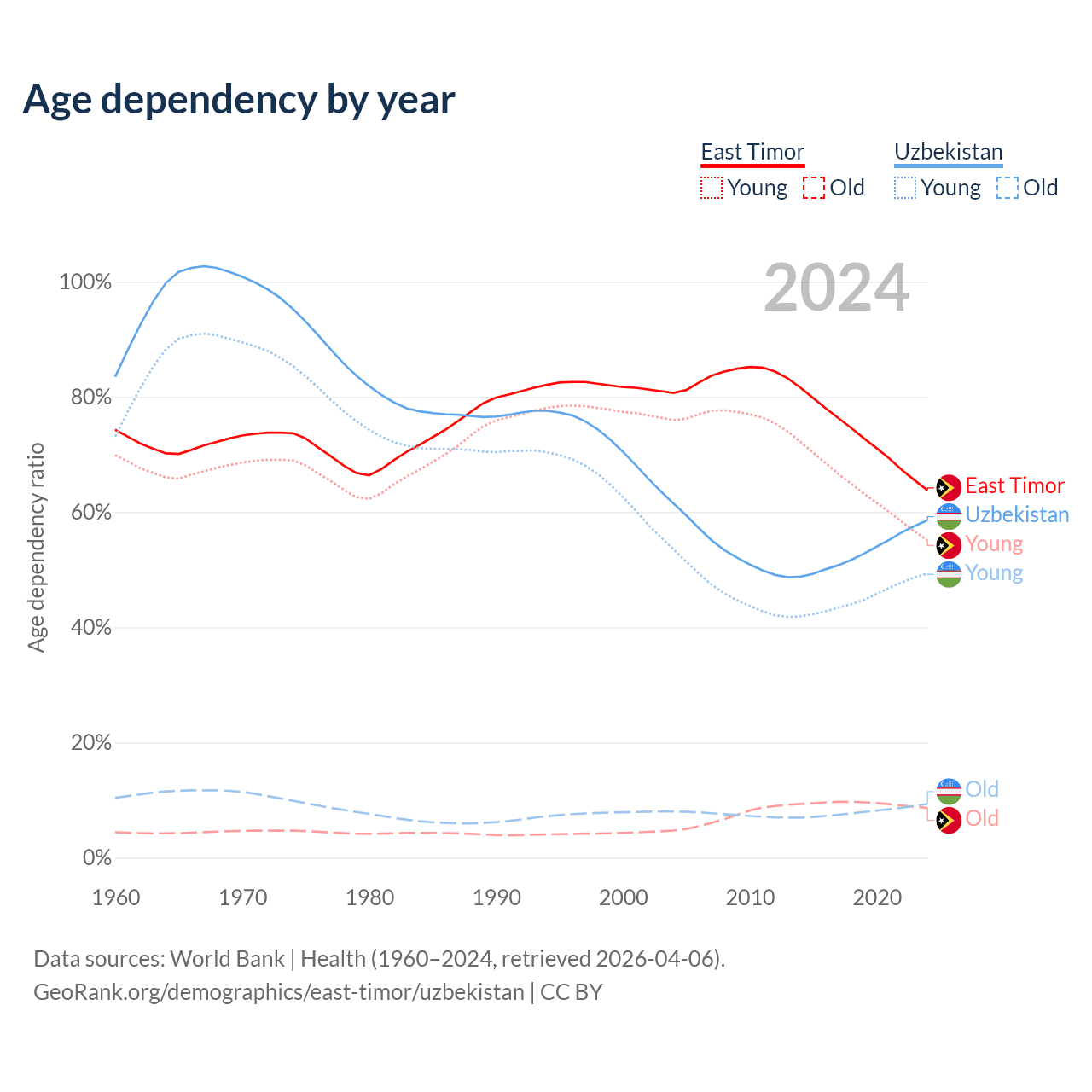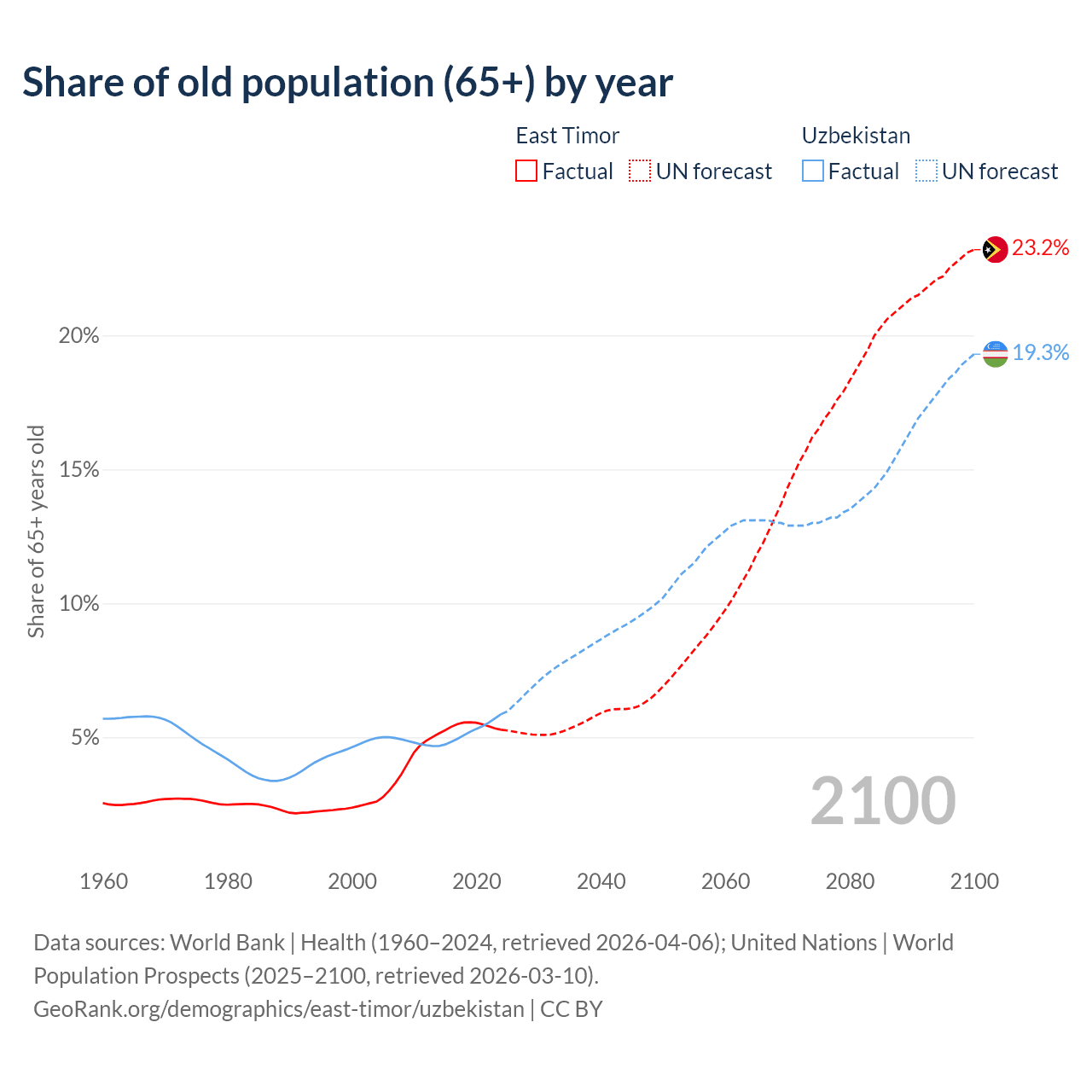 - The share of old-age demographic (65+) in East Timor is 5.28% vs 5.86% in Uzbekistan.