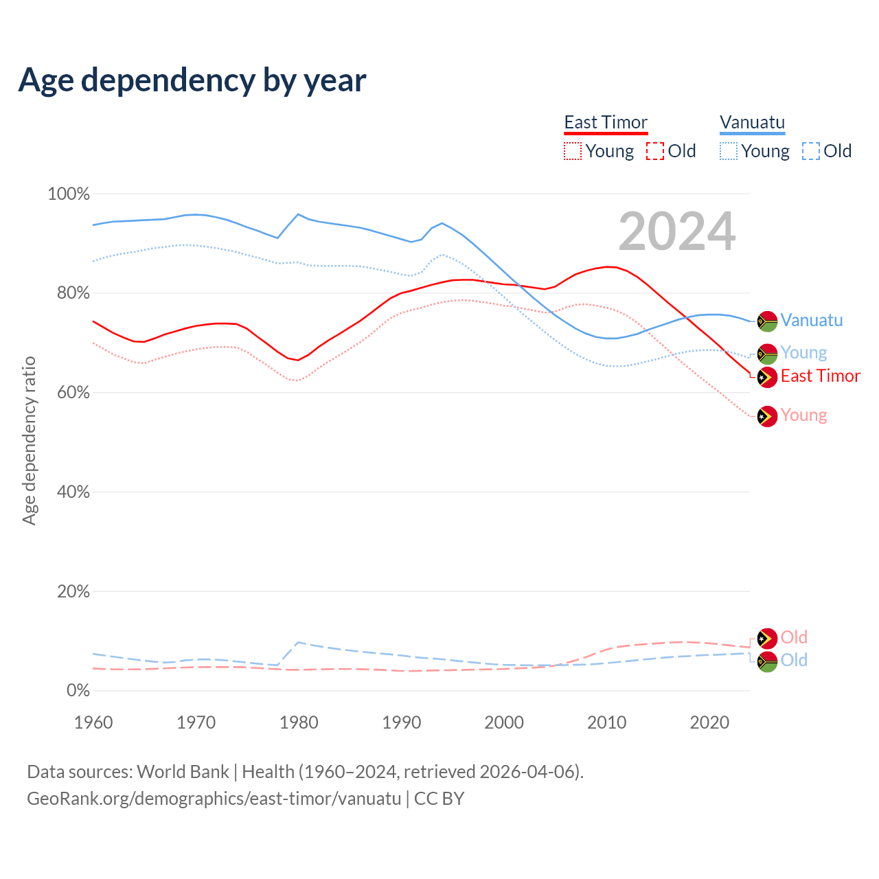 - East Timor is ranked 145/196 by median age (oldest to youngest) vs 156/196 for Vanuatu.