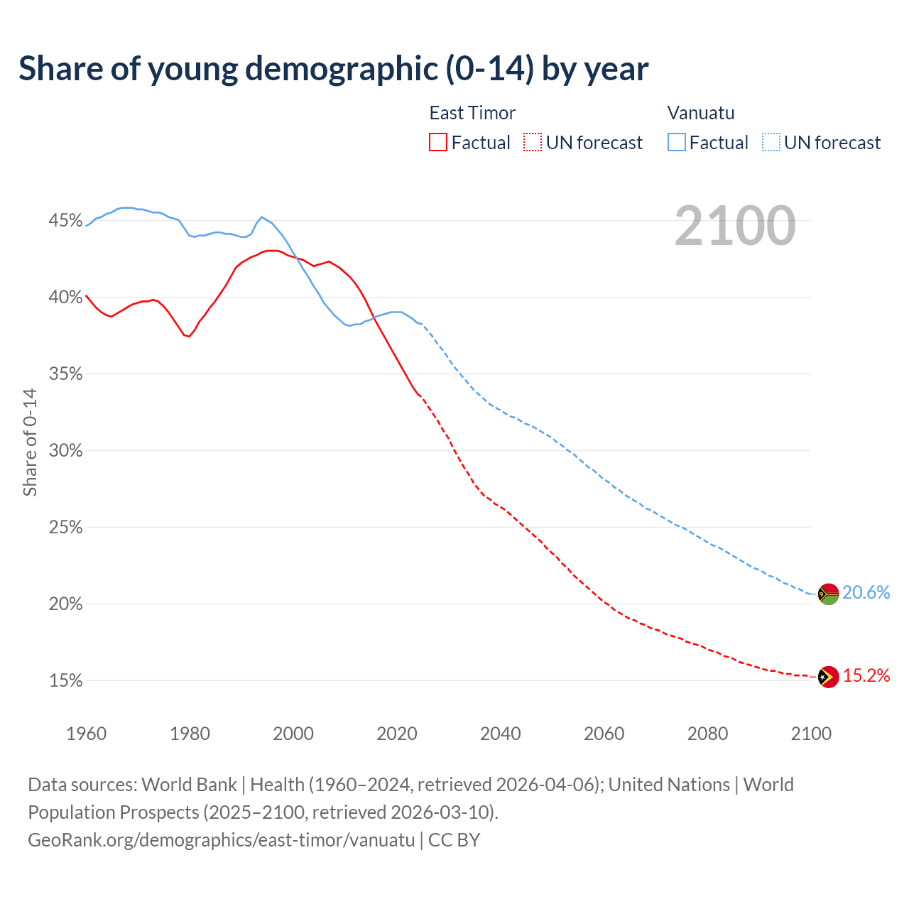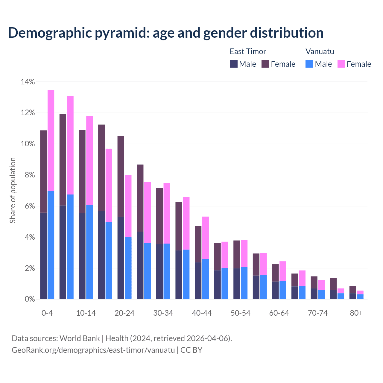 - As of 2026, the population of East Timor is 1.44M vs 345K in Vanuatu - 4.18 times difference.
