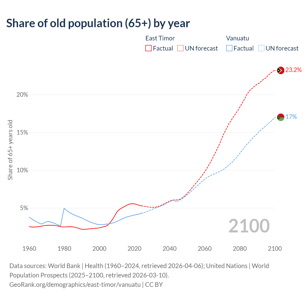 The share of older people aged 65 and over is 5.28% in East Timor and 4.3% in Vanuatu. Life expectancy in East Timor compared to Vanuatu .
