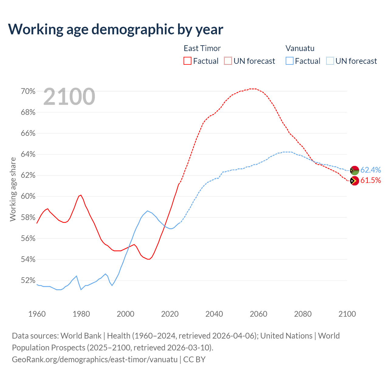 - East Timor has 880K working age adults (aged 15-64) vs 198K in Vanuatu.