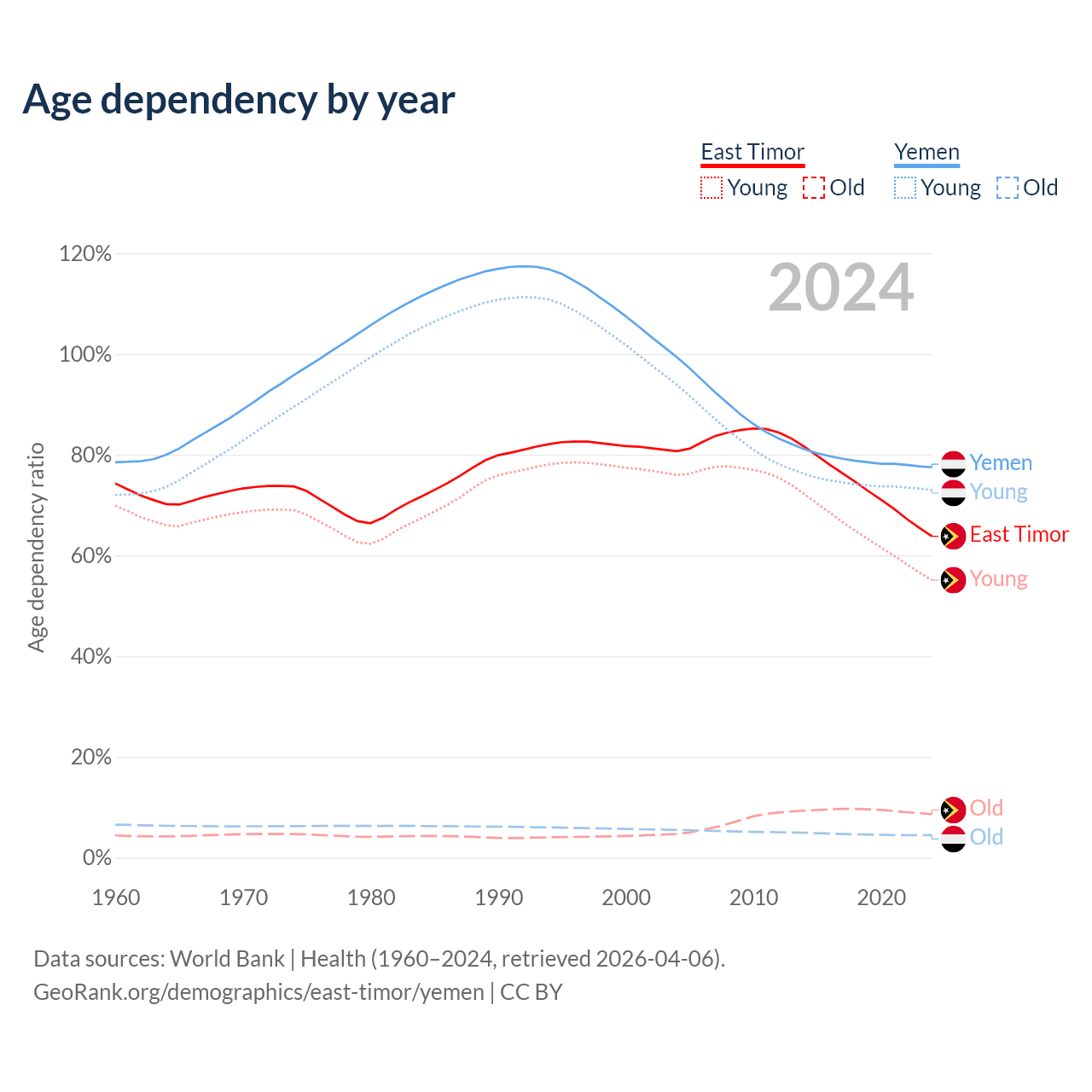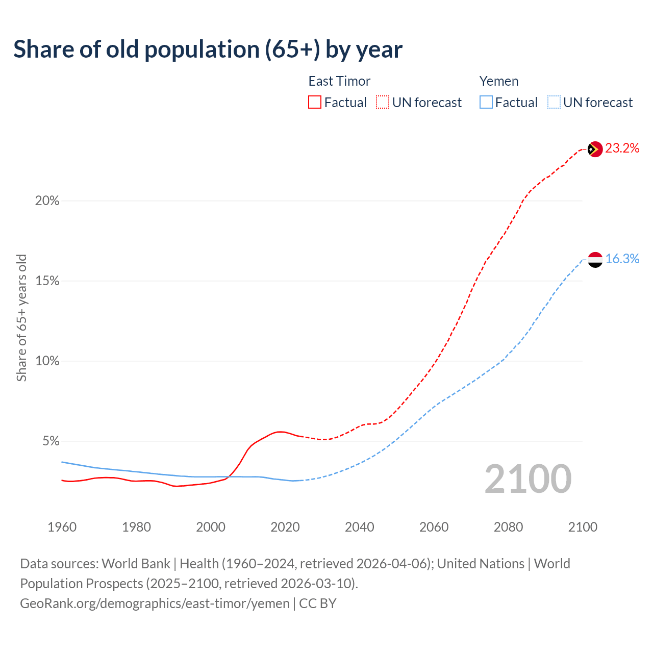 - The share of old-age demographic (65+) in East Timor is 5.28% vs 2.52% in Yemen.