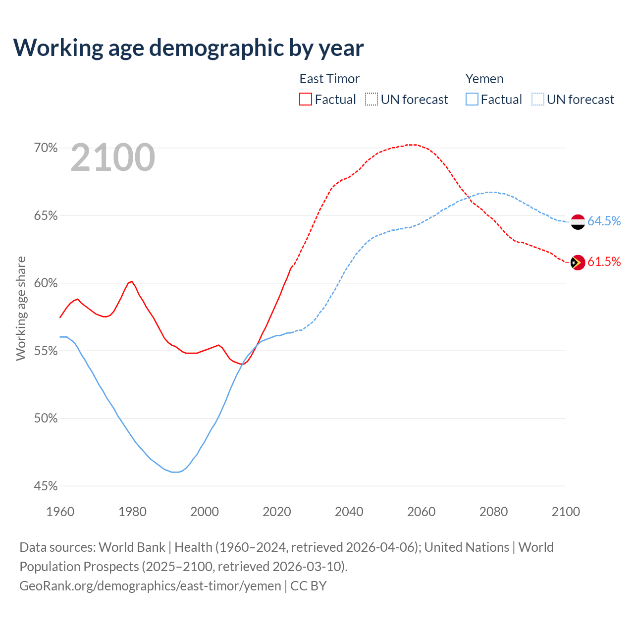 - East Timor has 880K working age adults (aged 15-64) vs 24.4M in Yemen.
