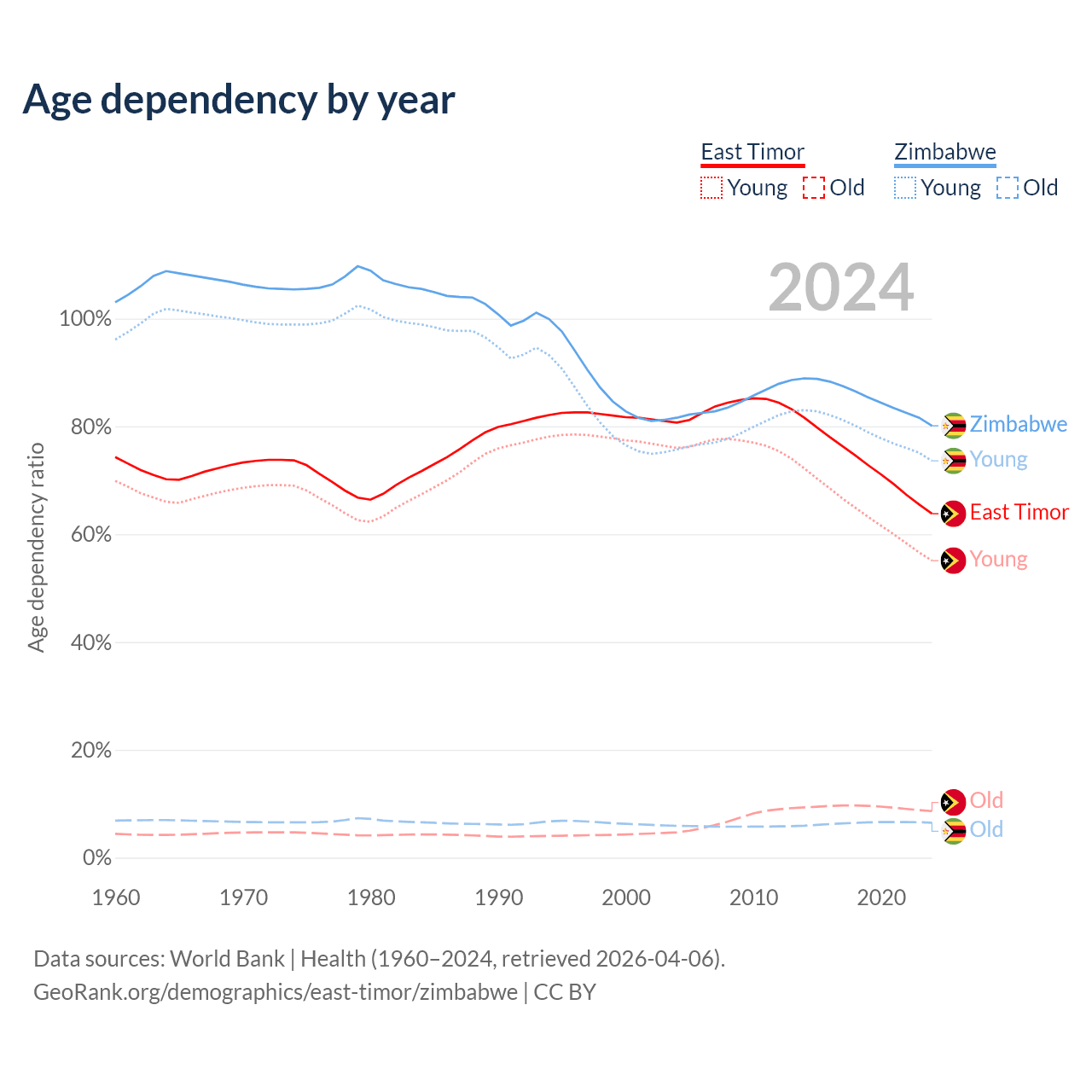 - East Timor is ranked 145/196 by median age (oldest to youngest) vs 177/196 for Zimbabwe.