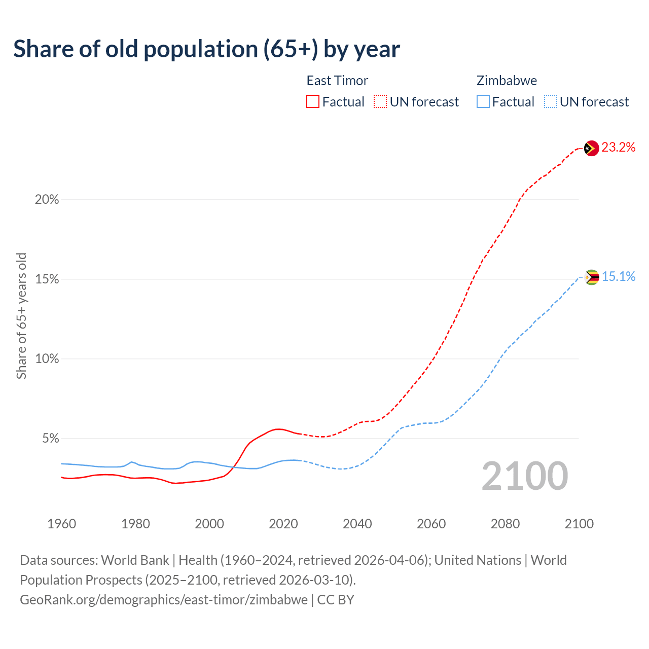 - The share of old-age demographic (65+) in East Timor is 5.28% vs 3.6% in Zimbabwe.