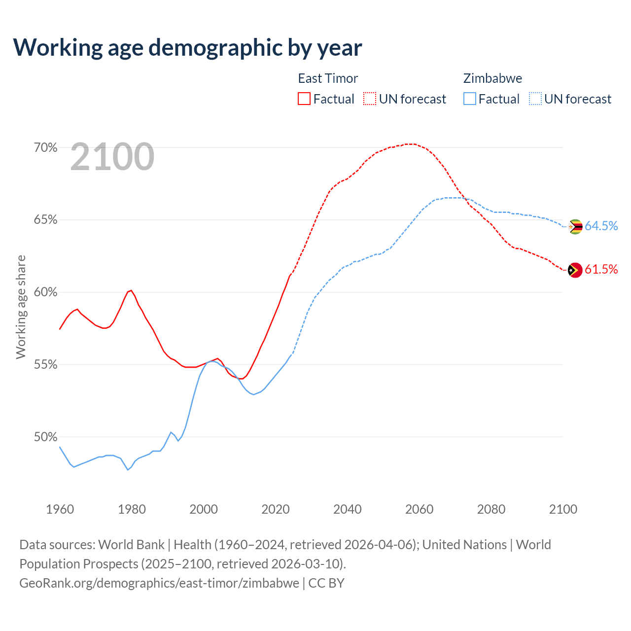 - East Timor has 880K working age adults (aged 15-64) vs 9.64M in Zimbabwe.