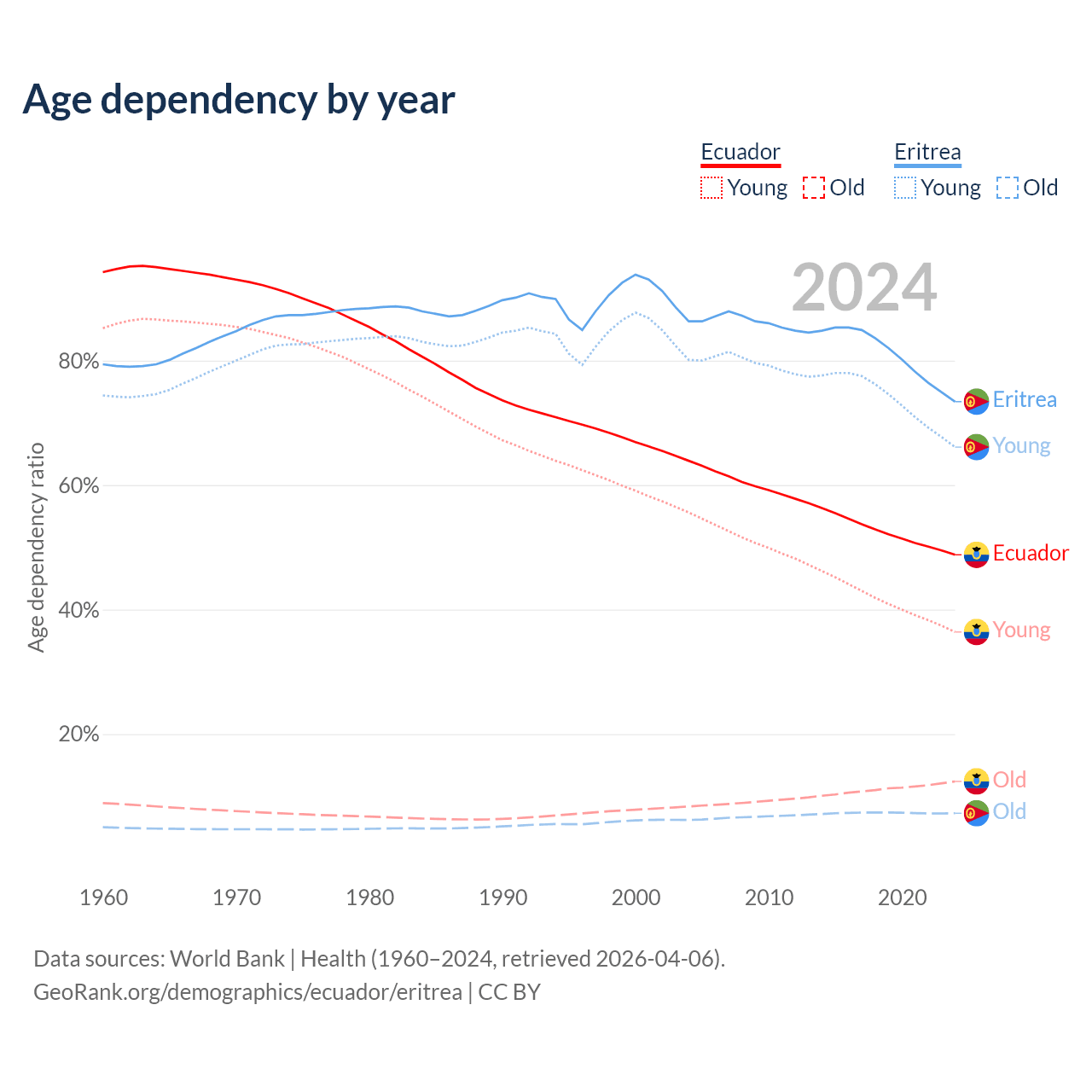 - The share of old-age demographic (65+) in Ecuador is 8.34% vs 4.2% in Eritrea.