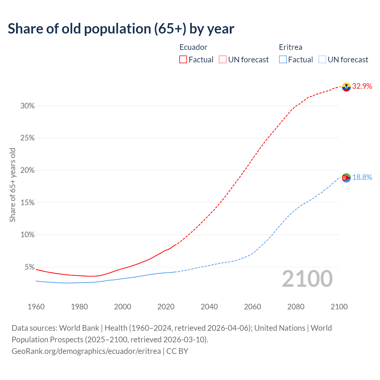 The share of older people aged 65 and over is 8.34% in Ecuador and 4.2% in Eritrea. Life expectancy in Ecuador compared to Eritrea .