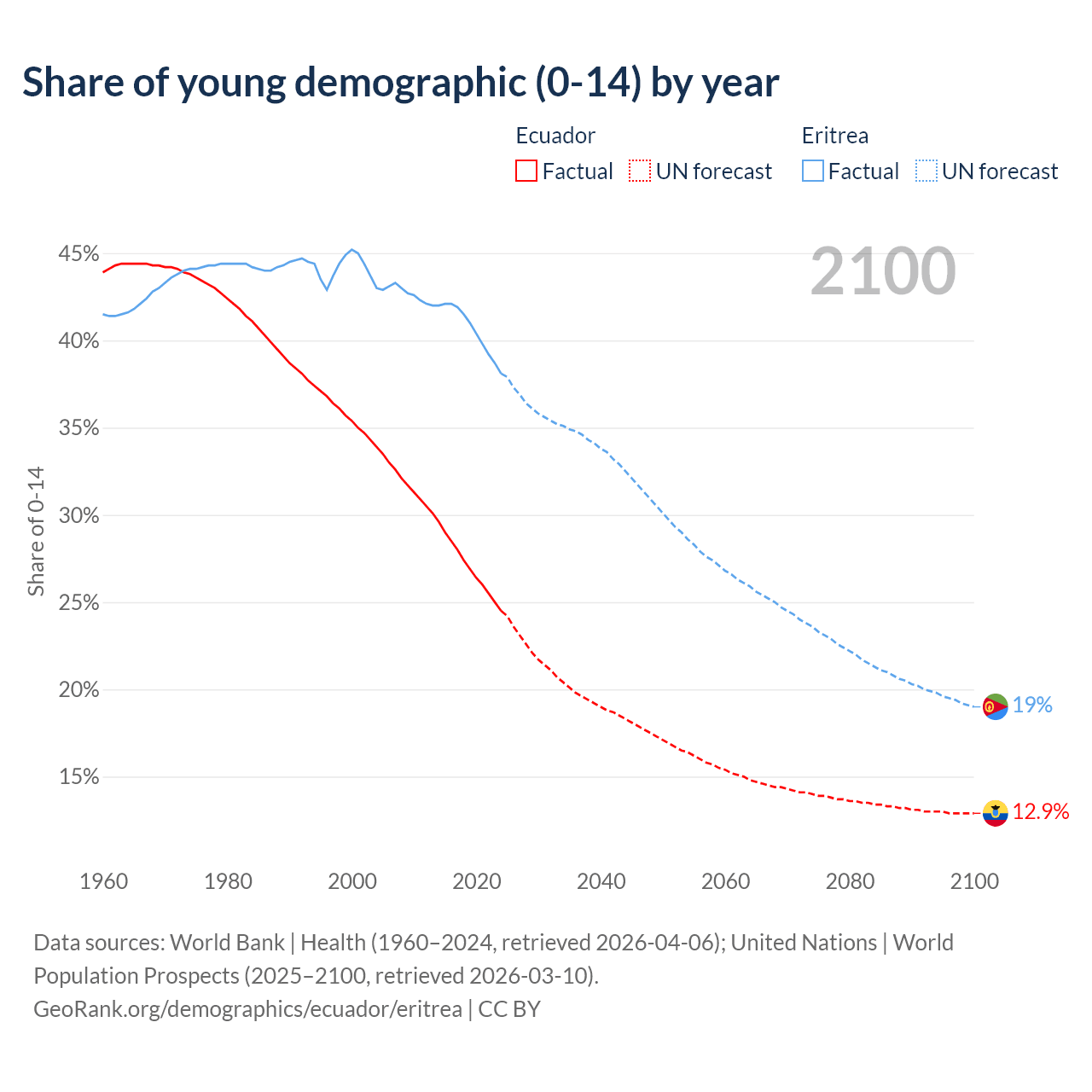 - The share of young demographic (0-15 years old) in Ecuador is 24.5% vs 38.1% in Eritrea.