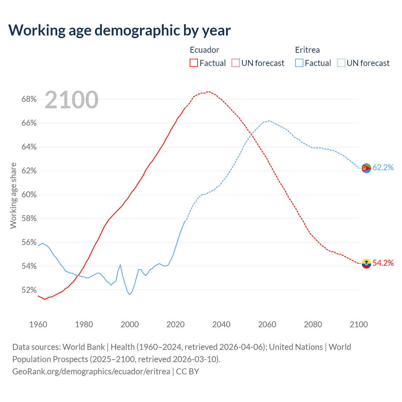 Median age Ecuador vs Eritrea, 1960-2100