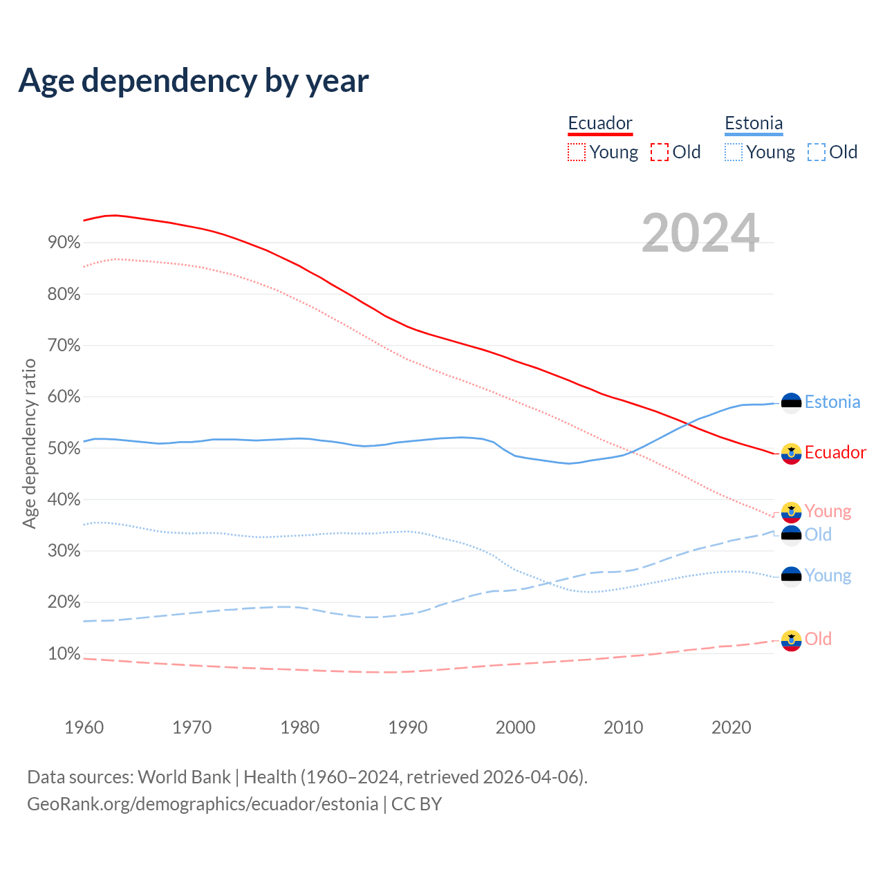 - Ecuador is ranked 105/196 by median age (oldest to youngest) vs 25/196 for Estonia.