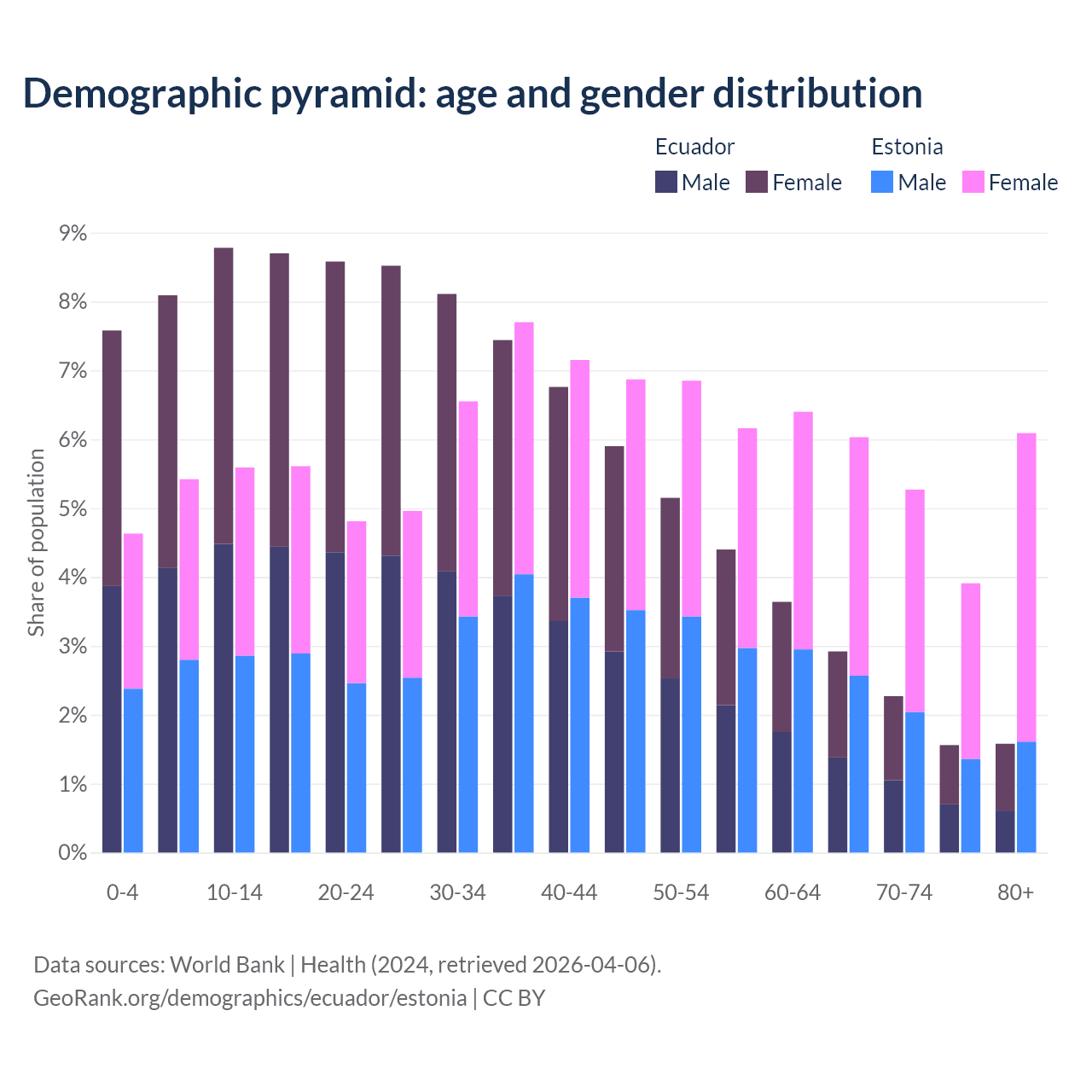 The share of older people aged 65 and over is 8.34% in Ecuador and 21.3% in Estonia. Life expectancy in Ecuador compared to Estonia .