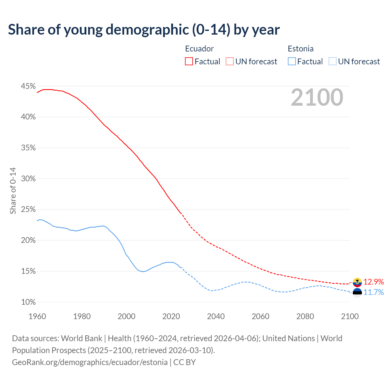 - The share of young demographic (0-15 years old) in Ecuador is 24.5% vs 15.6% in Estonia.