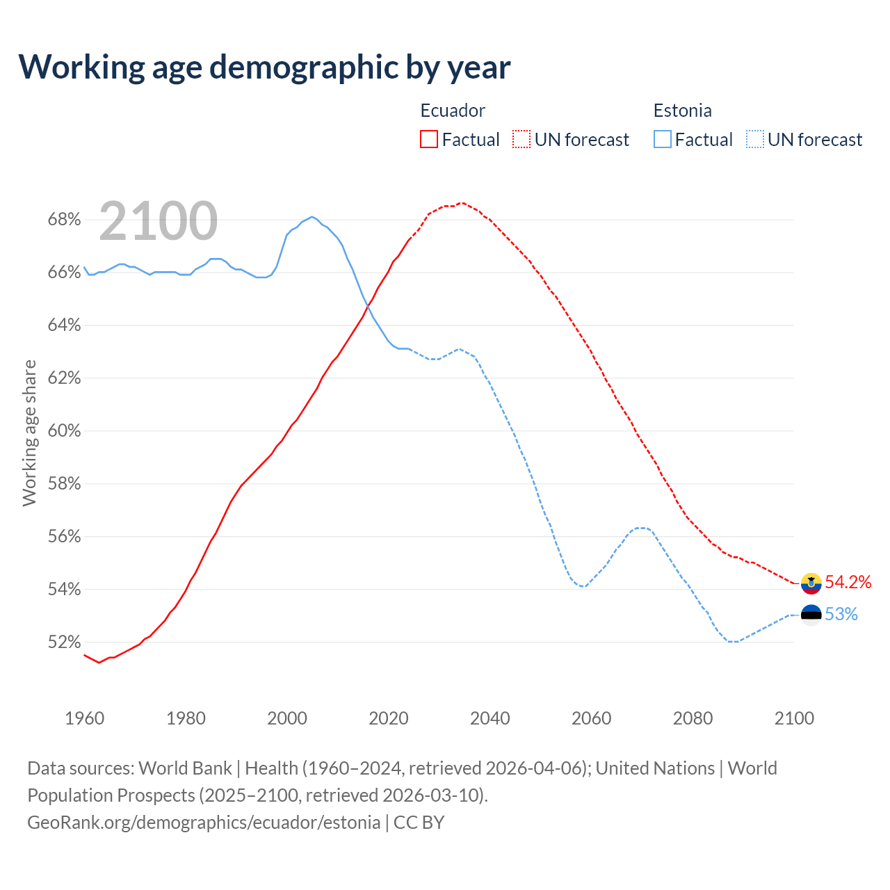 Median age Ecuador vs Estonia, 1960-2100