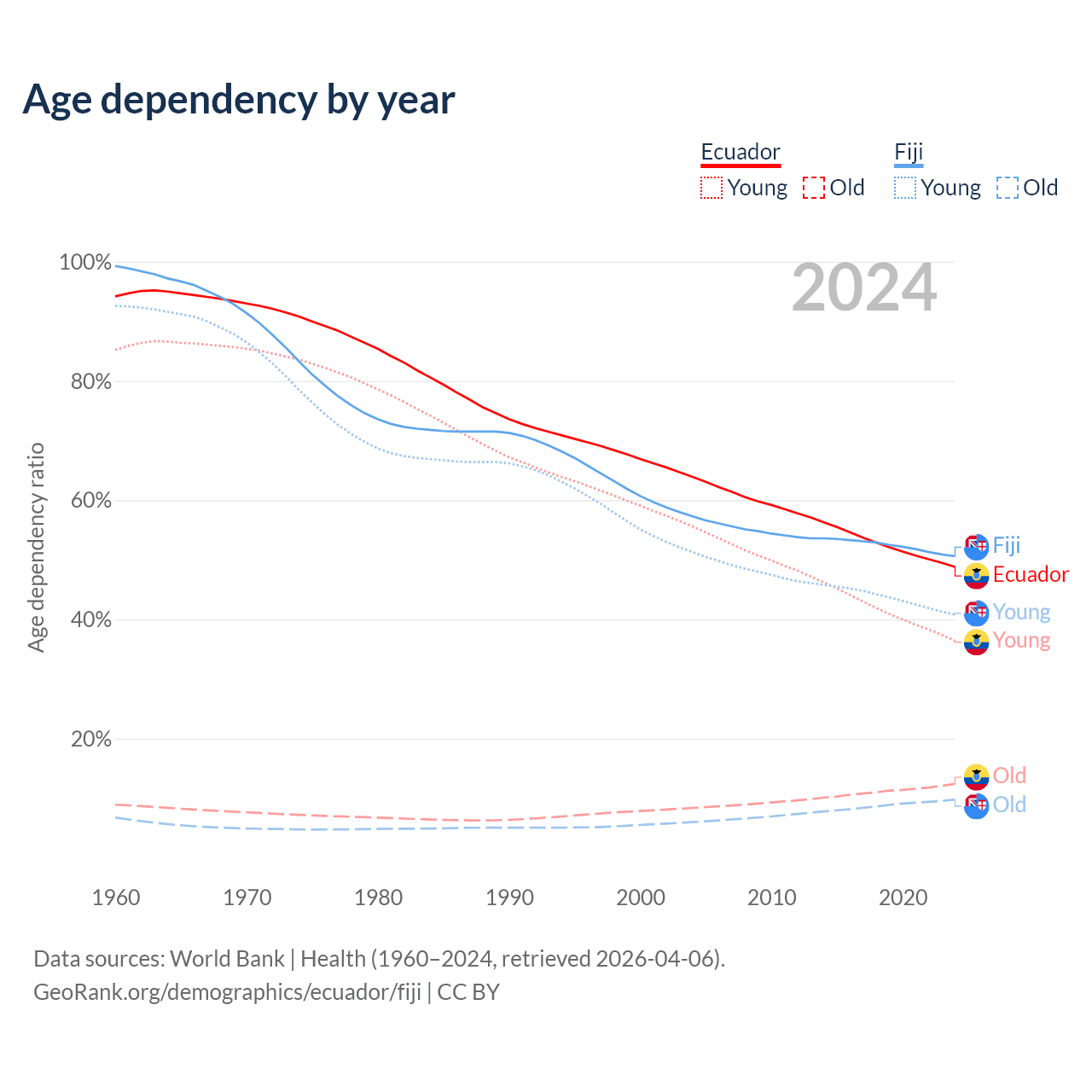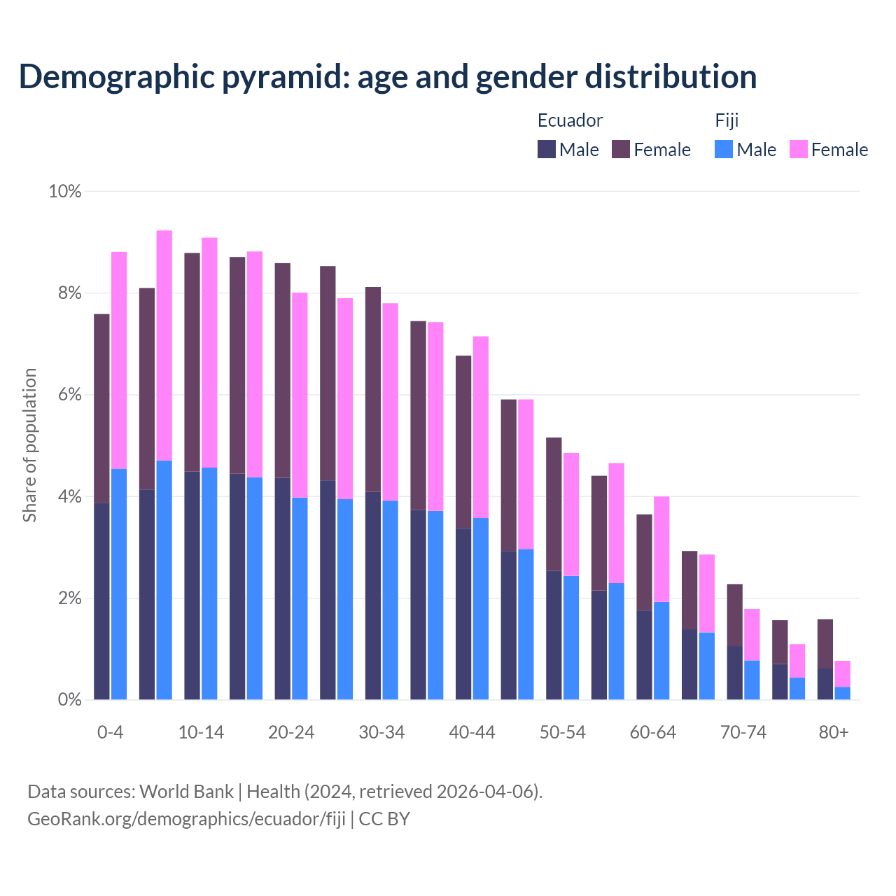 - The share of old-age demographic (65+) in Ecuador is 8.34% vs 6.49% in Fiji.