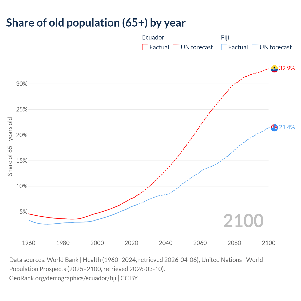 The share of older people aged 65 and over is 8.34% in Ecuador and 6.49% in Fiji. Life expectancy in Ecuador compared to Fiji .