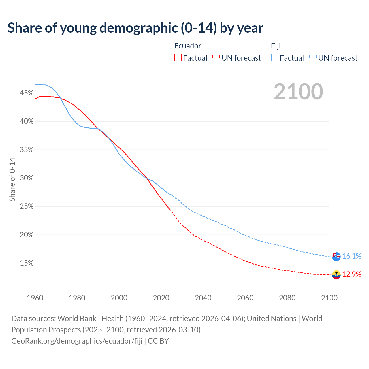 - The share of young demographic (0-15 years old) in Ecuador is 24.5% vs 27.1% in Fiji.