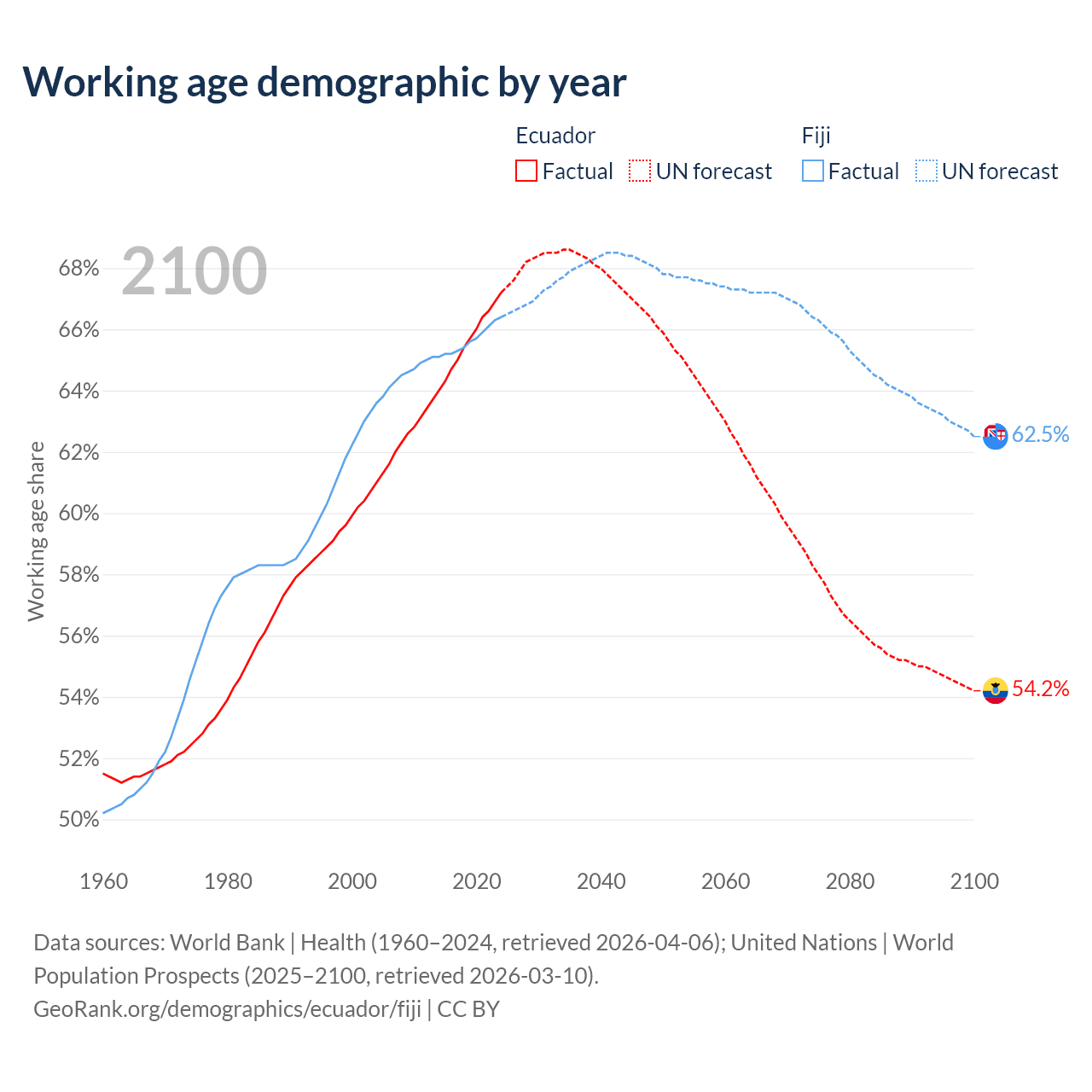 Median age Ecuador vs Fiji, 1960-2100