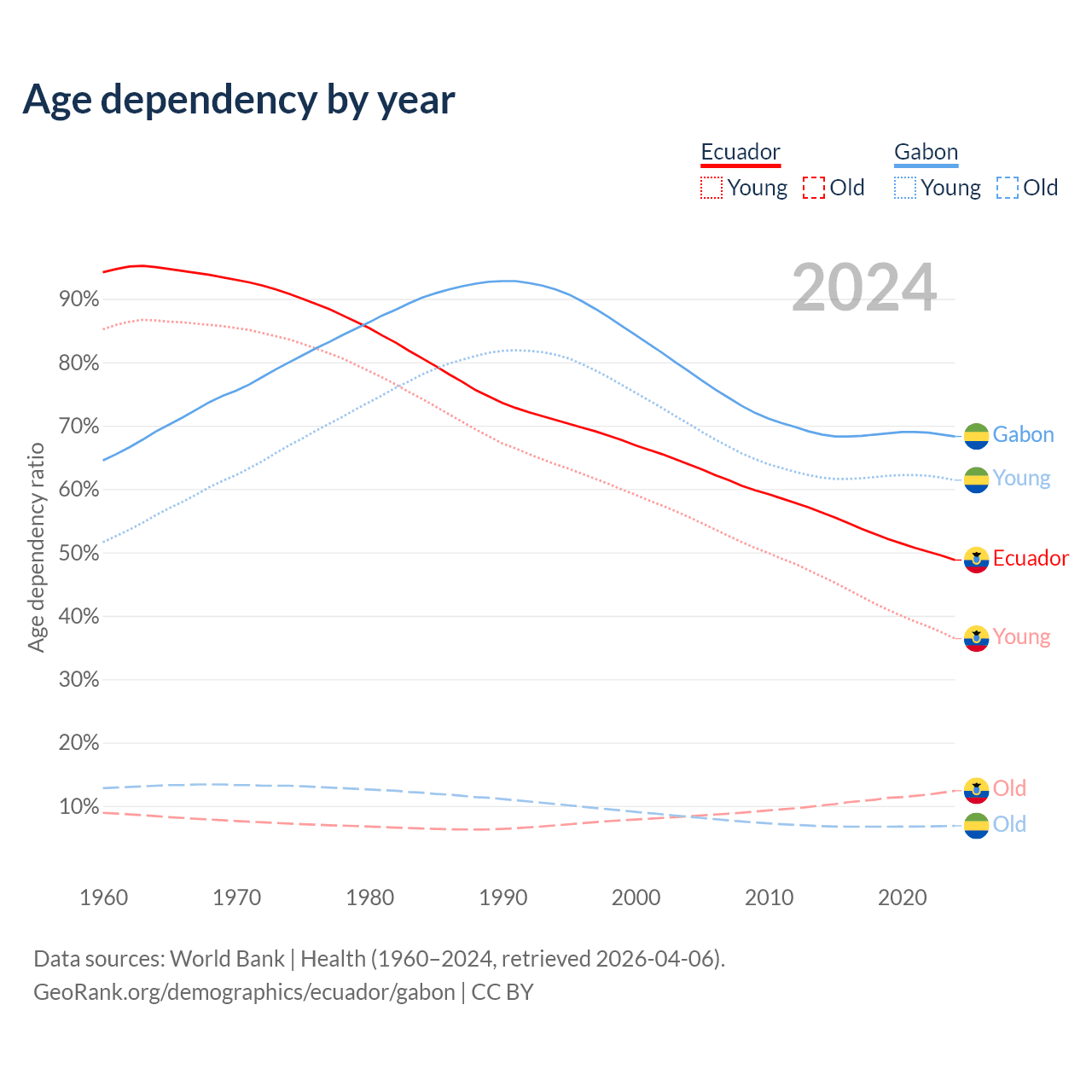 - The share of old-age demographic (65+) in Ecuador is 8.34% vs 4.08% in Gabon.