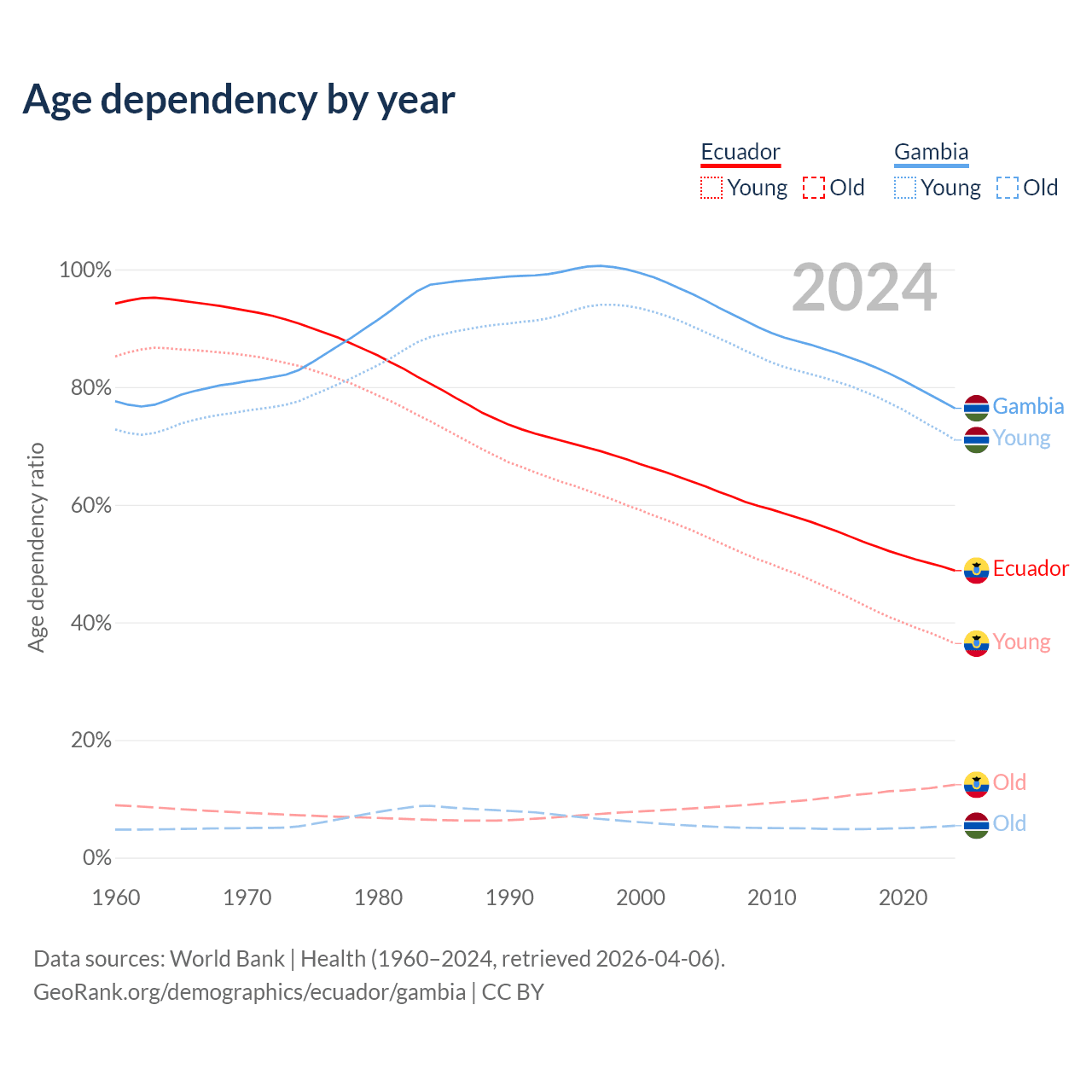 - The share of old-age demographic (65+) in Ecuador is 8.34% vs 3.08% in the Gambia.