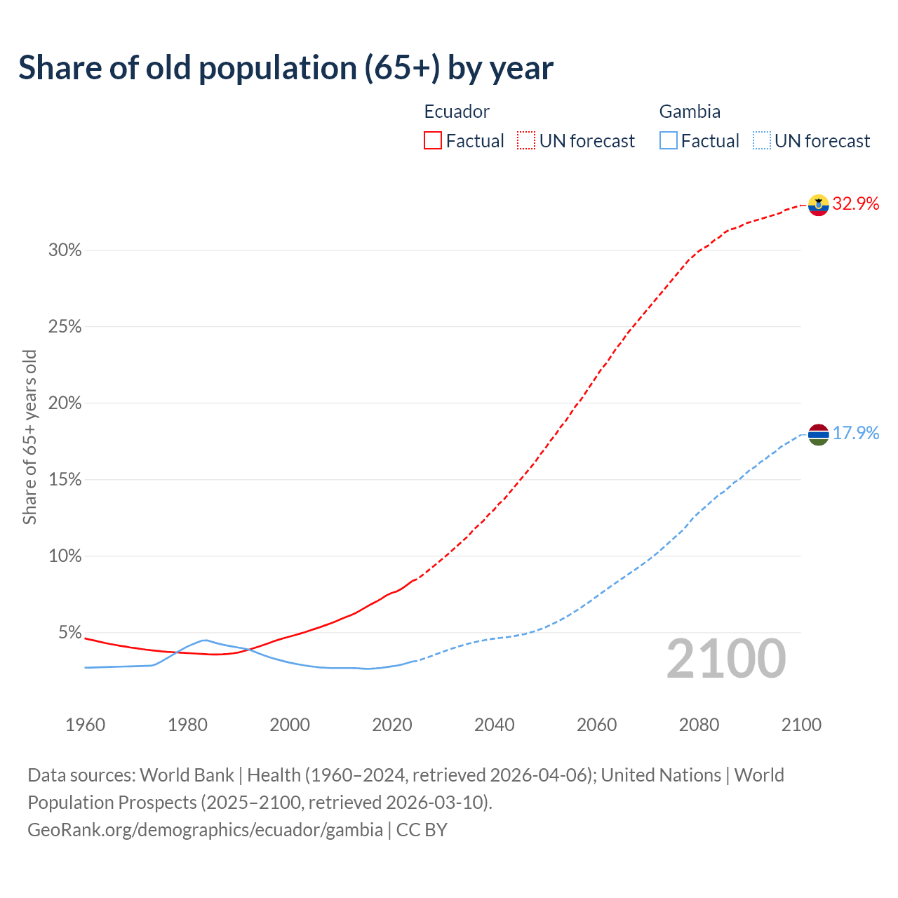 The share of older people aged 65 and over is 8.34% in Ecuador and 3.08% in the Gambia. Life expectancy in Ecuador compared to the Gambia .