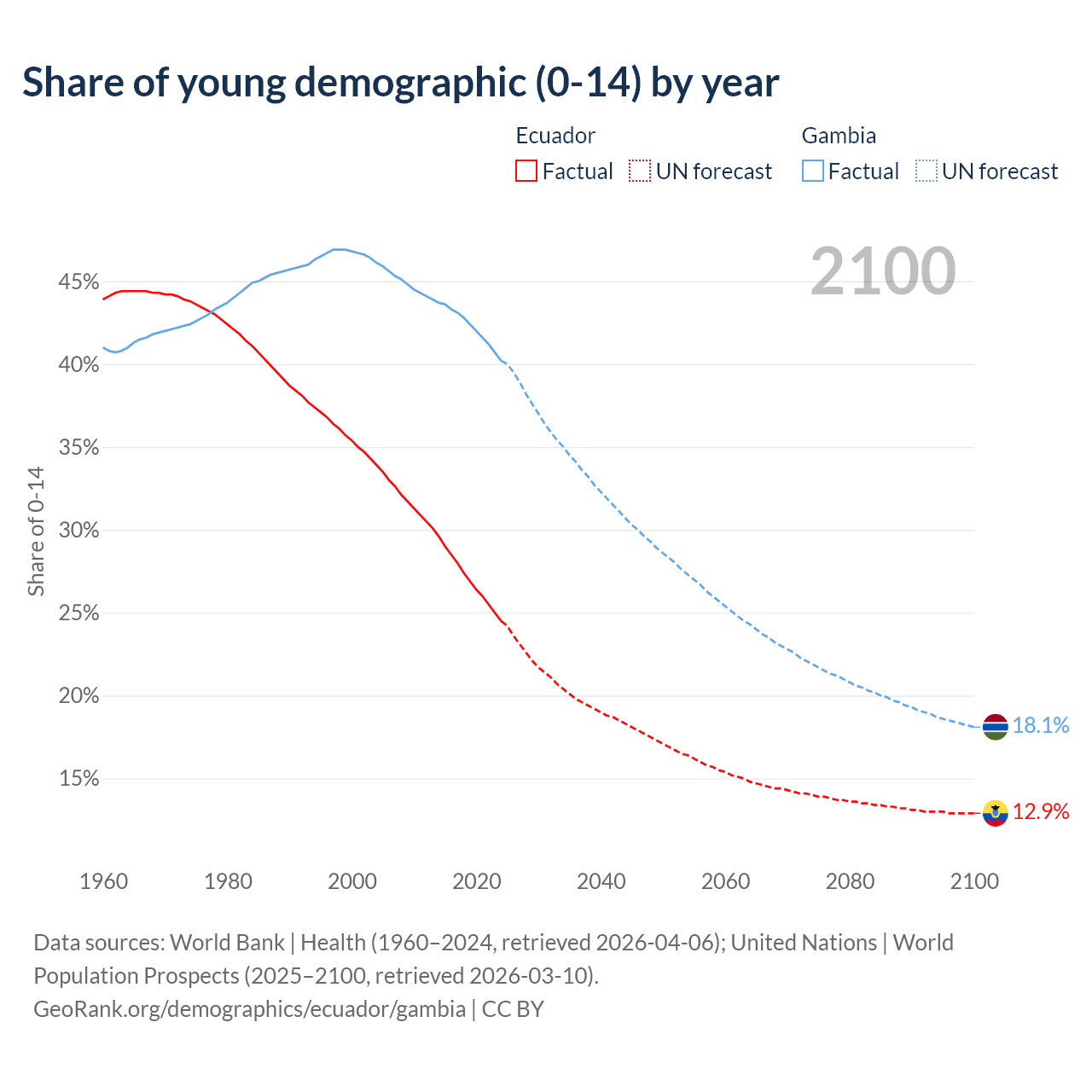 - The share of young demographic (0-15 years old) in Ecuador is 24.5% vs 40.2% in the Gambia.