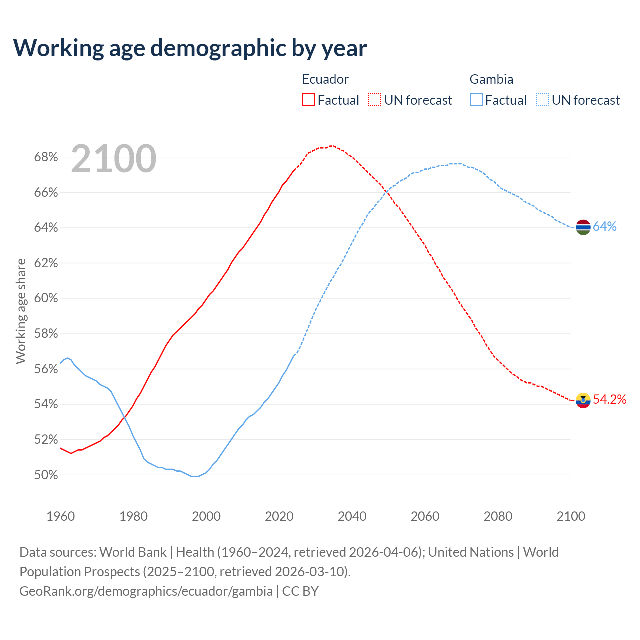 Median age Ecuador vs Gambia, 1960-2100