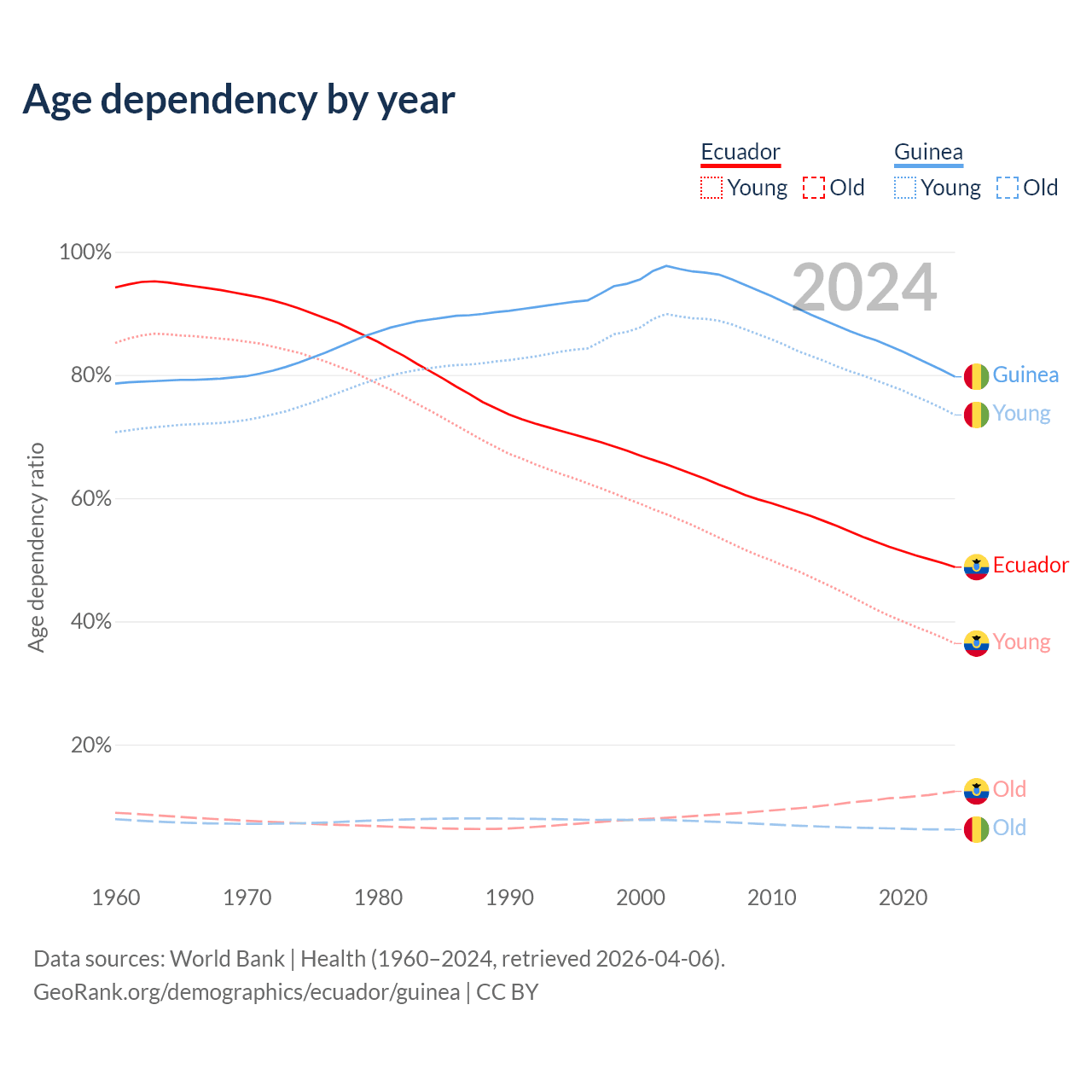 - Ecuador is ranked 105/196 by median age (oldest to youngest) vs 176/196 for Guinea.