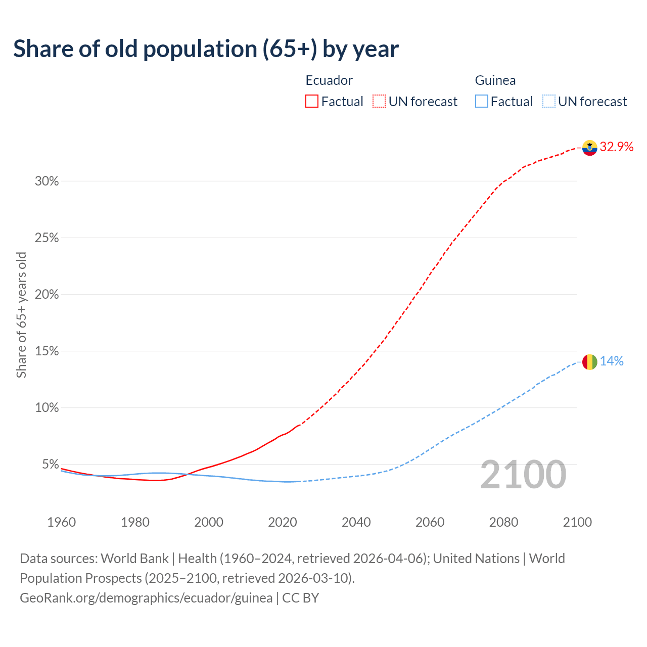 The share of older people aged 65 and over is 8.34% in Ecuador and 3.46% in Guinea. Life expectancy in Ecuador compared to Guinea .
