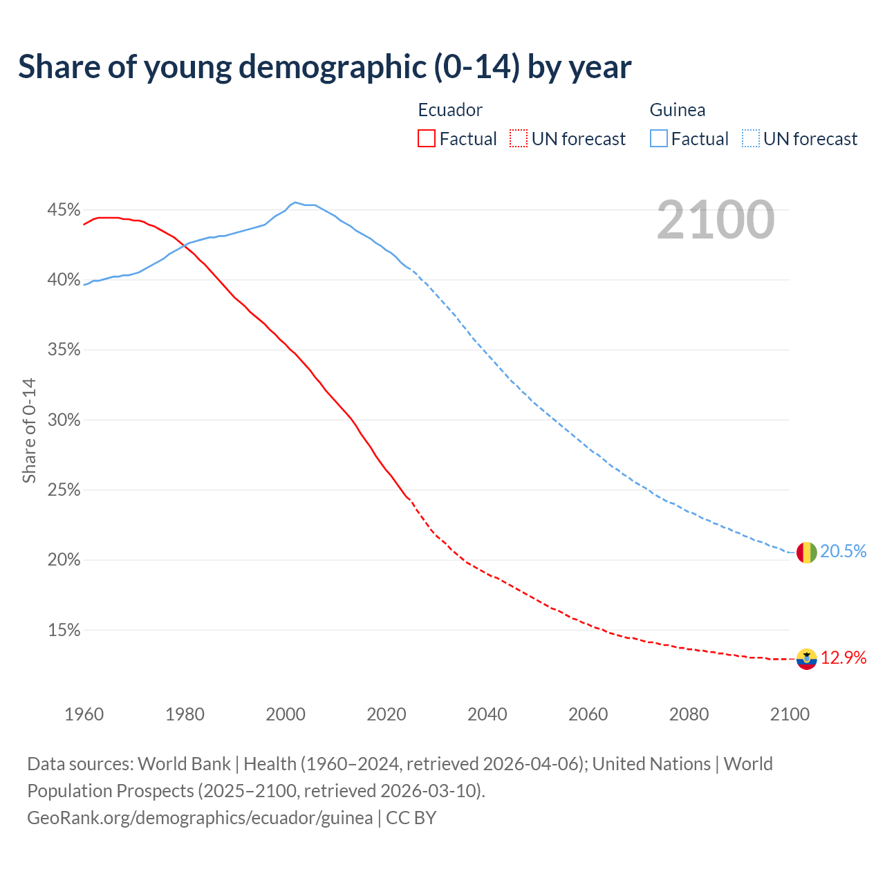 - The share of young demographic (0-15 years old) in Ecuador is 24.5% vs 40.9% in Guinea.