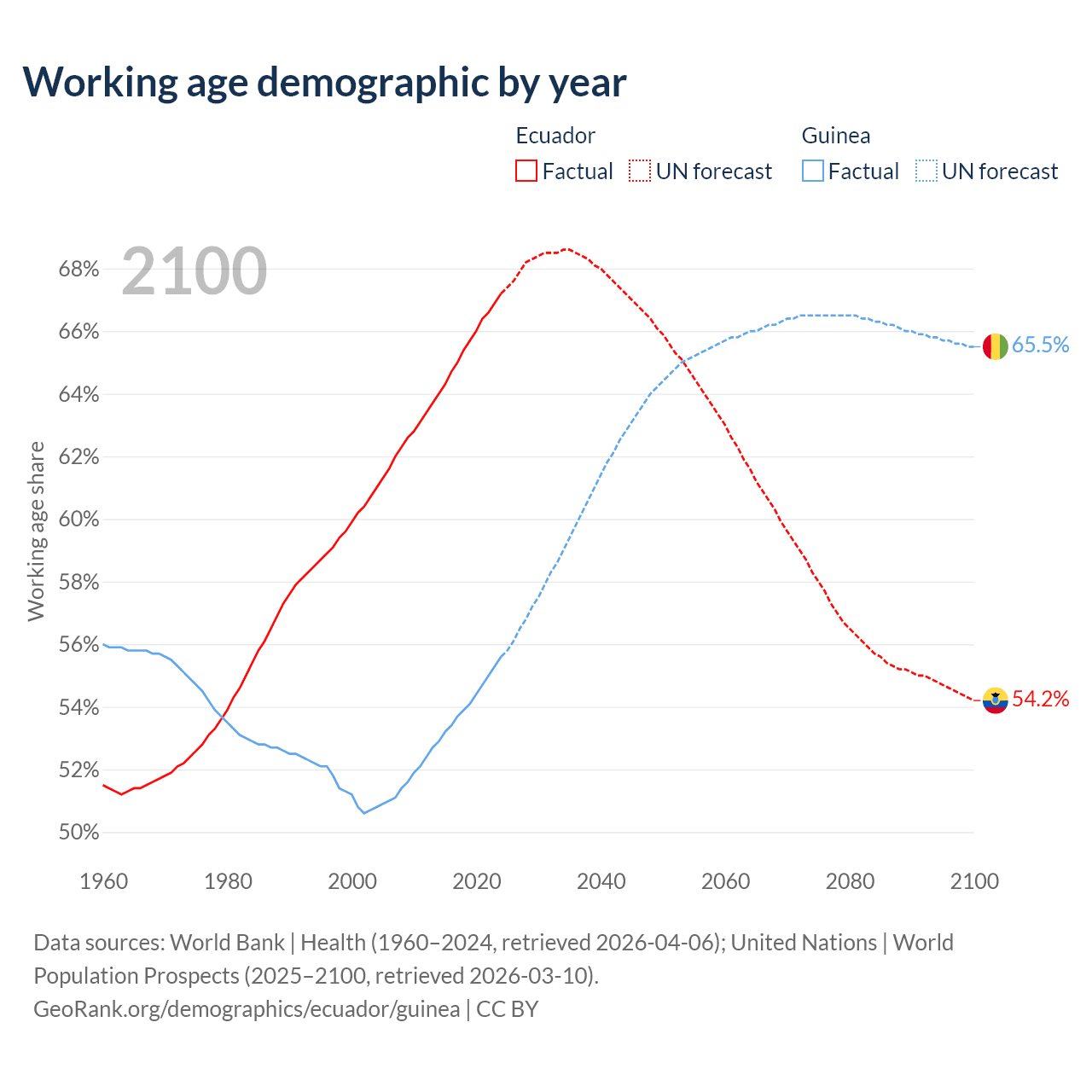 Median age Ecuador vs Guinea, 1960-2100