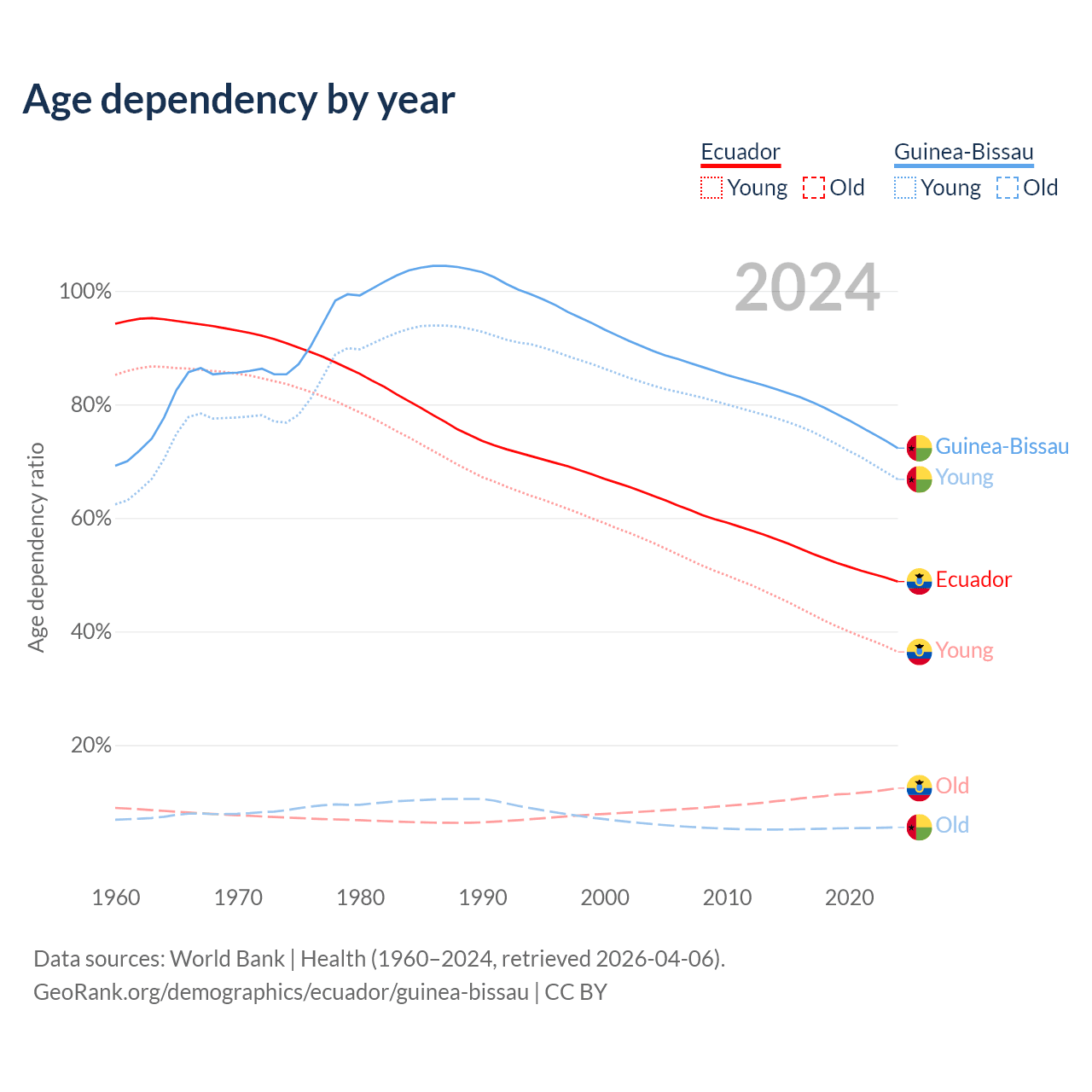 - The share of old-age demographic (65+) in Ecuador is 8.34% vs 3.19% in Guinea-Bissau.