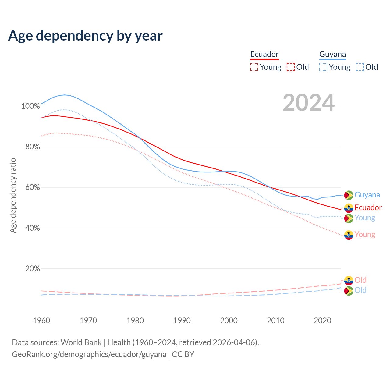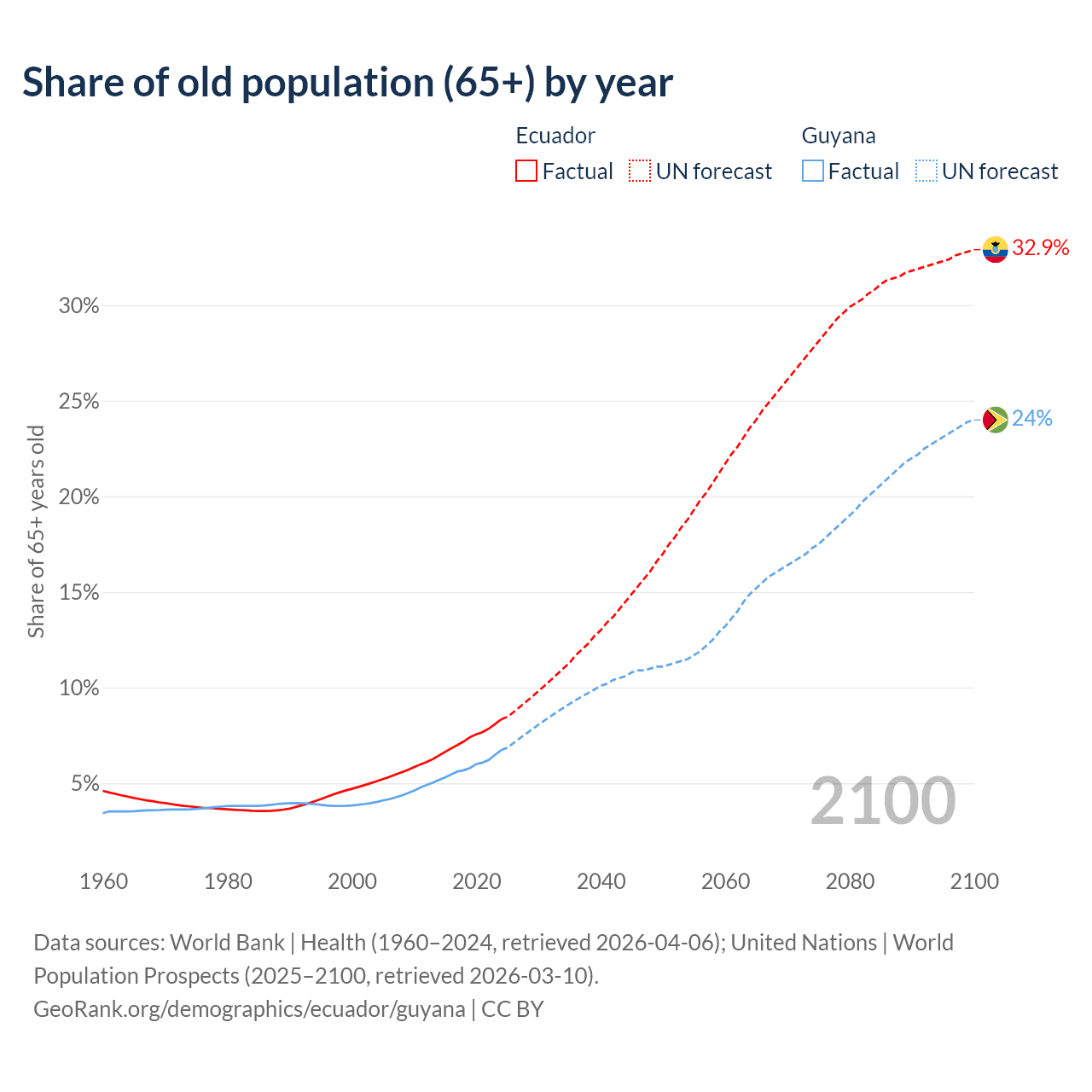 - The share of old-age demographic (65+) in Ecuador is 8.34% vs 6.73% in Guyana.