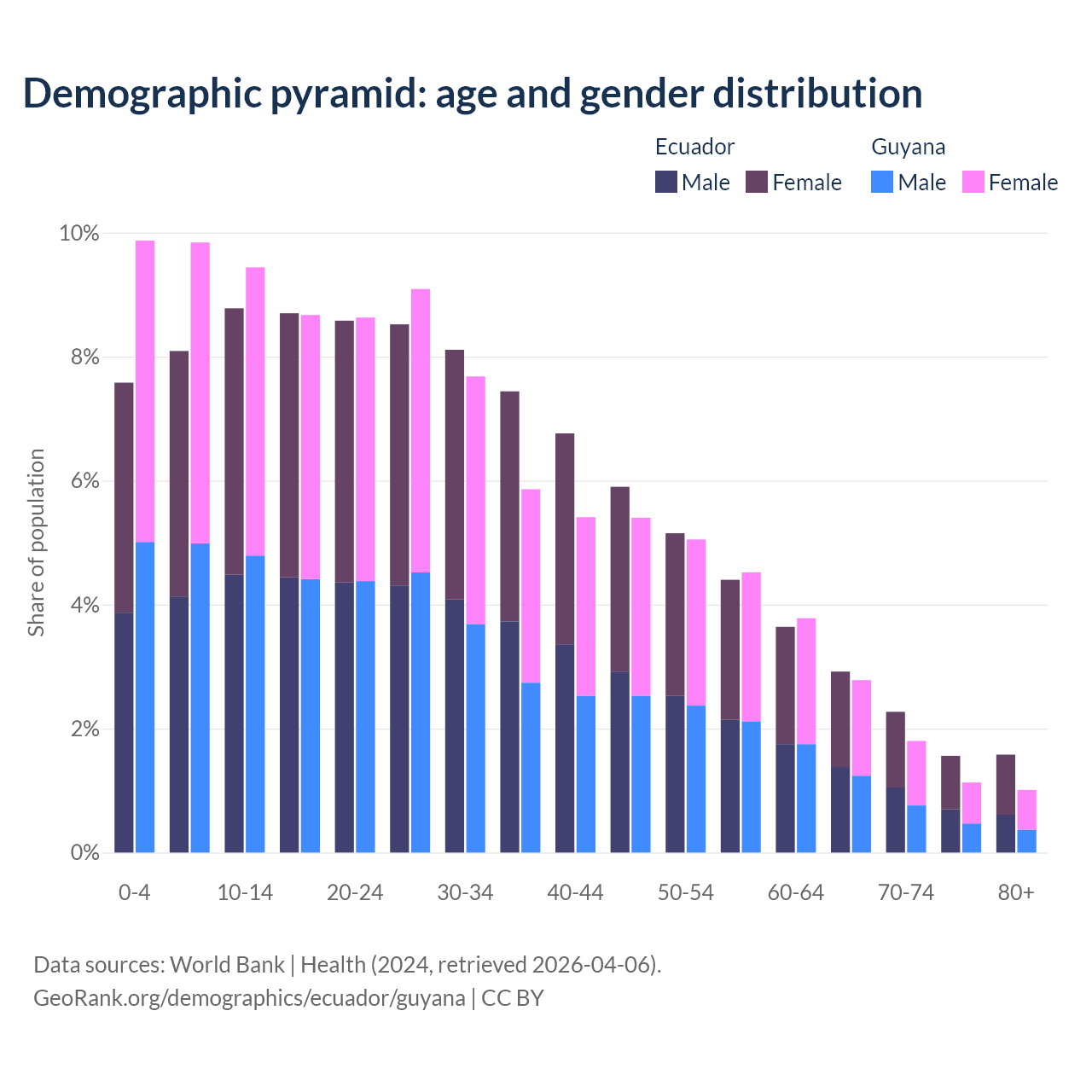 - Ecuador is ranked 105/196 by median age (oldest to youngest) vs 122/196 for Guyana.