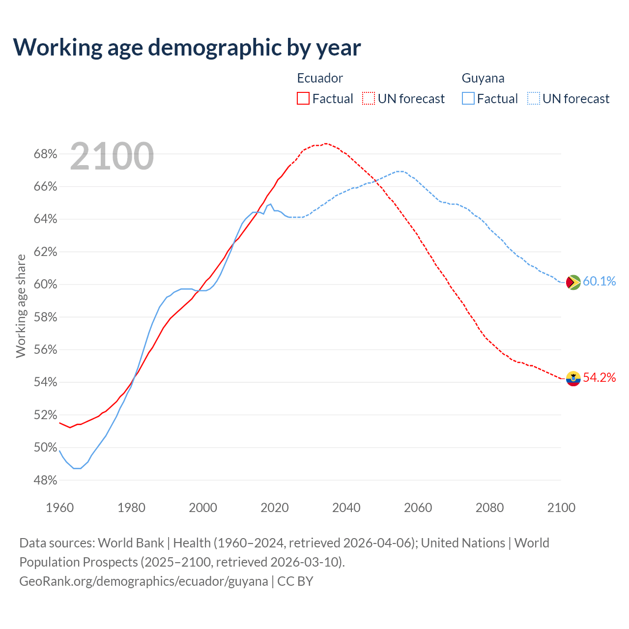 - Ecuador has 12.4M working age adults (aged 15-64) vs 540K in Guyana.