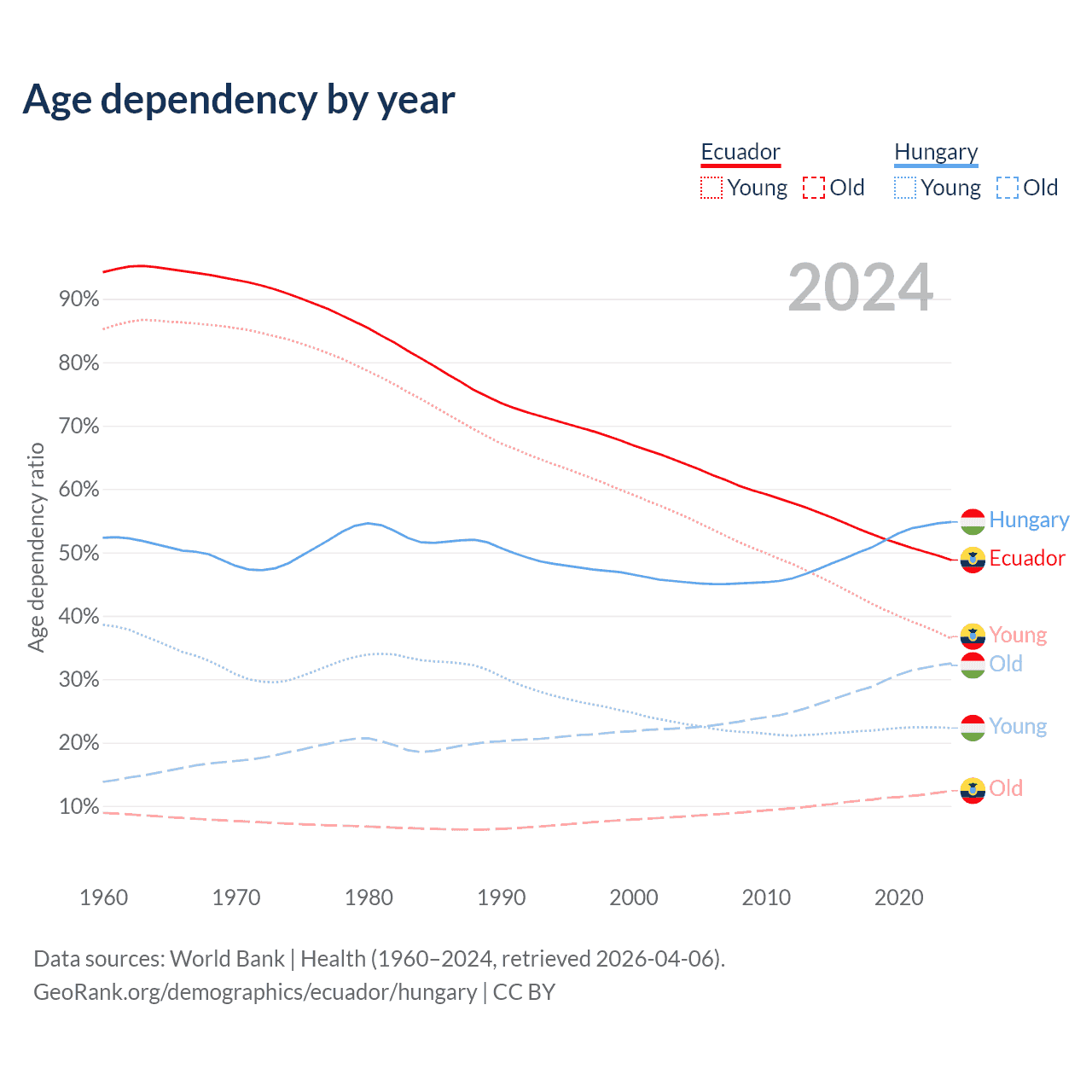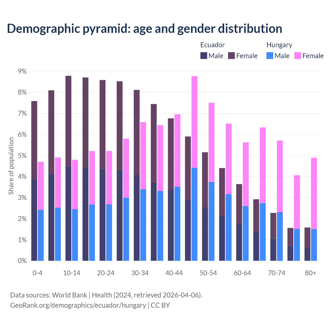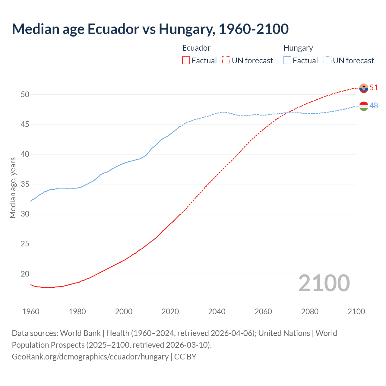 - Ecuador is ranked 105/196 by median age (oldest to youngest) vs 17/196 for Hungary.
