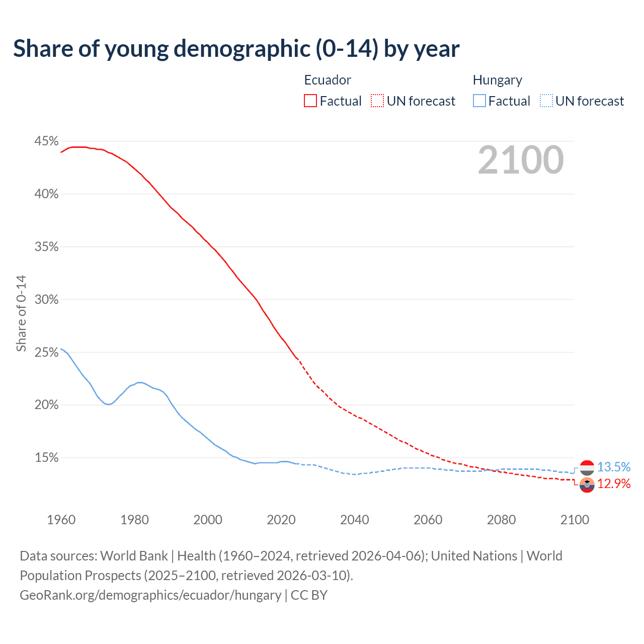 - The share of young demographic (0-15 years old) in Ecuador is 24.5% vs 14.4% in Hungary.