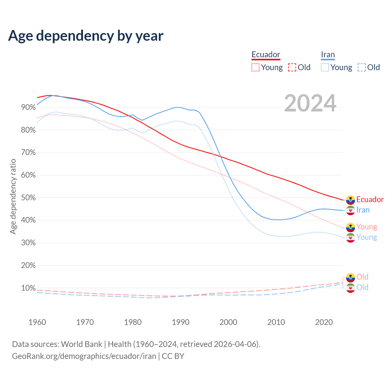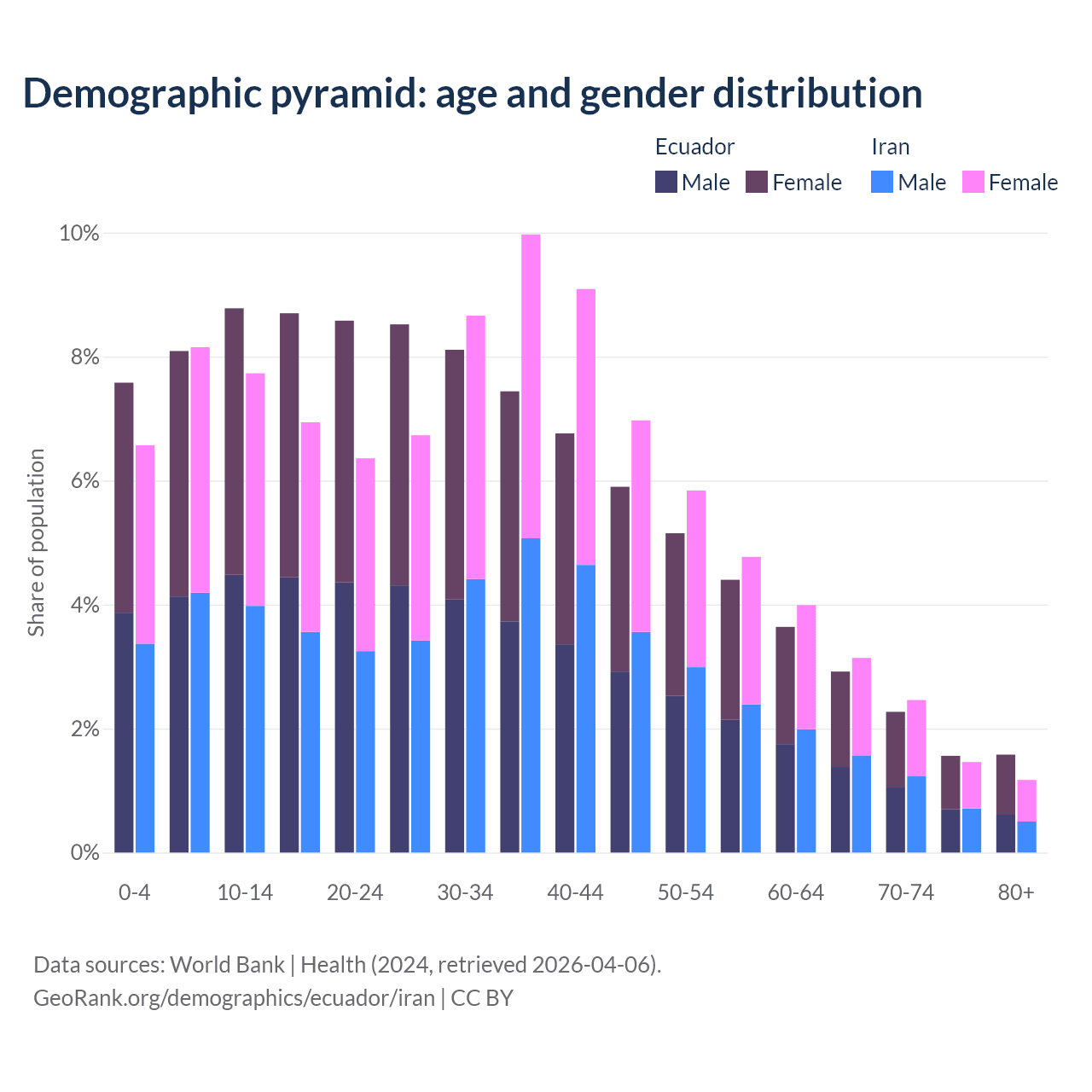- Ecuador is ranked 105/196 by median age (oldest to youngest) vs 79/196 for Iran.