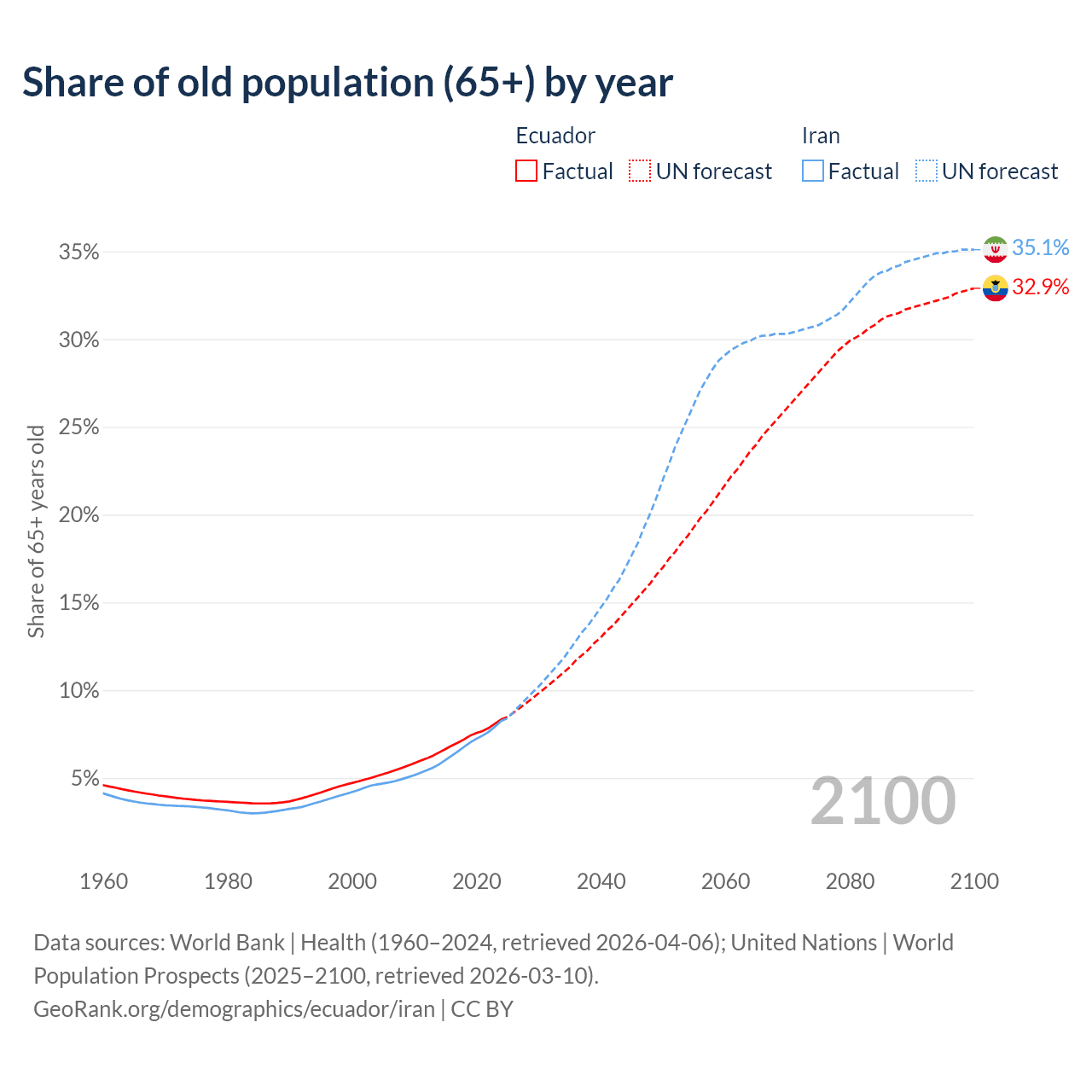 - The share of old-age demographic (65+) in Ecuador is 8.34% vs 8.24% in Iran.