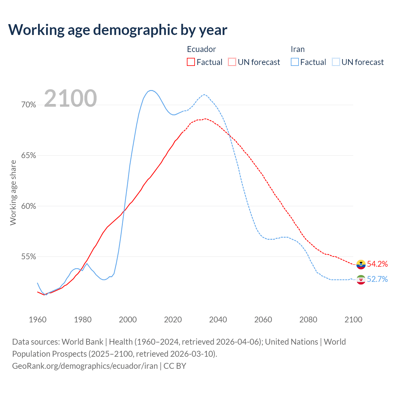 - Ecuador has 12.4M working age adults (aged 15-64) vs 64.8M in Iran.