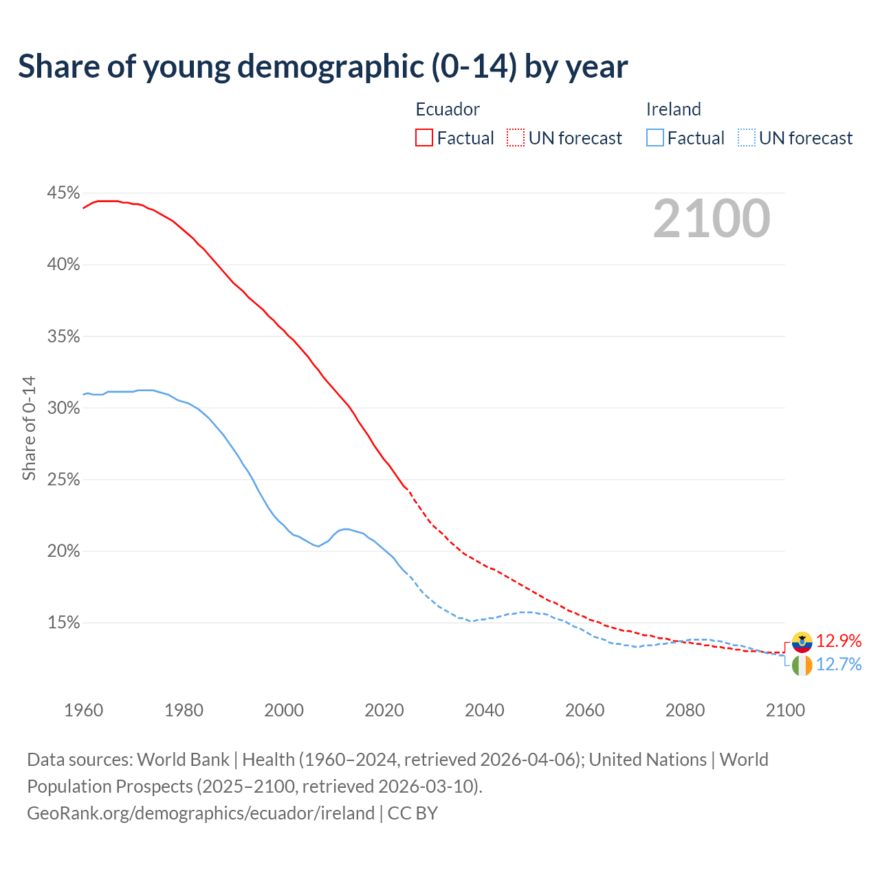 - The share of young demographic (0-15 years old) in Ecuador is 24.5% vs 18.6% in Ireland.