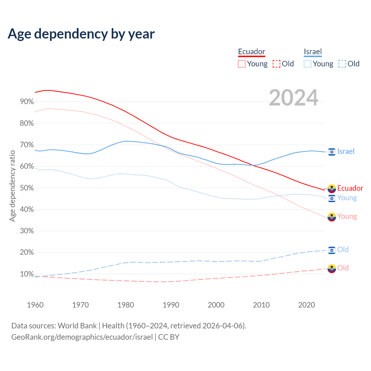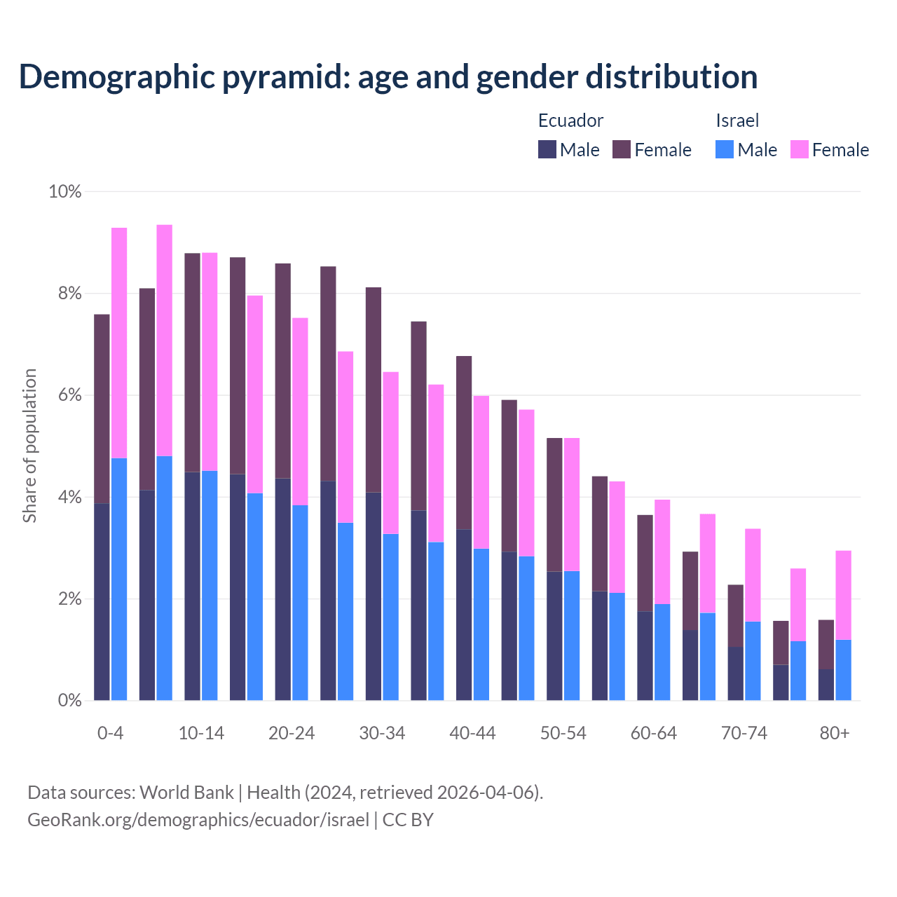 - Ecuador is ranked 105/196 by median age (oldest to youngest) vs 103/196 for Israel.