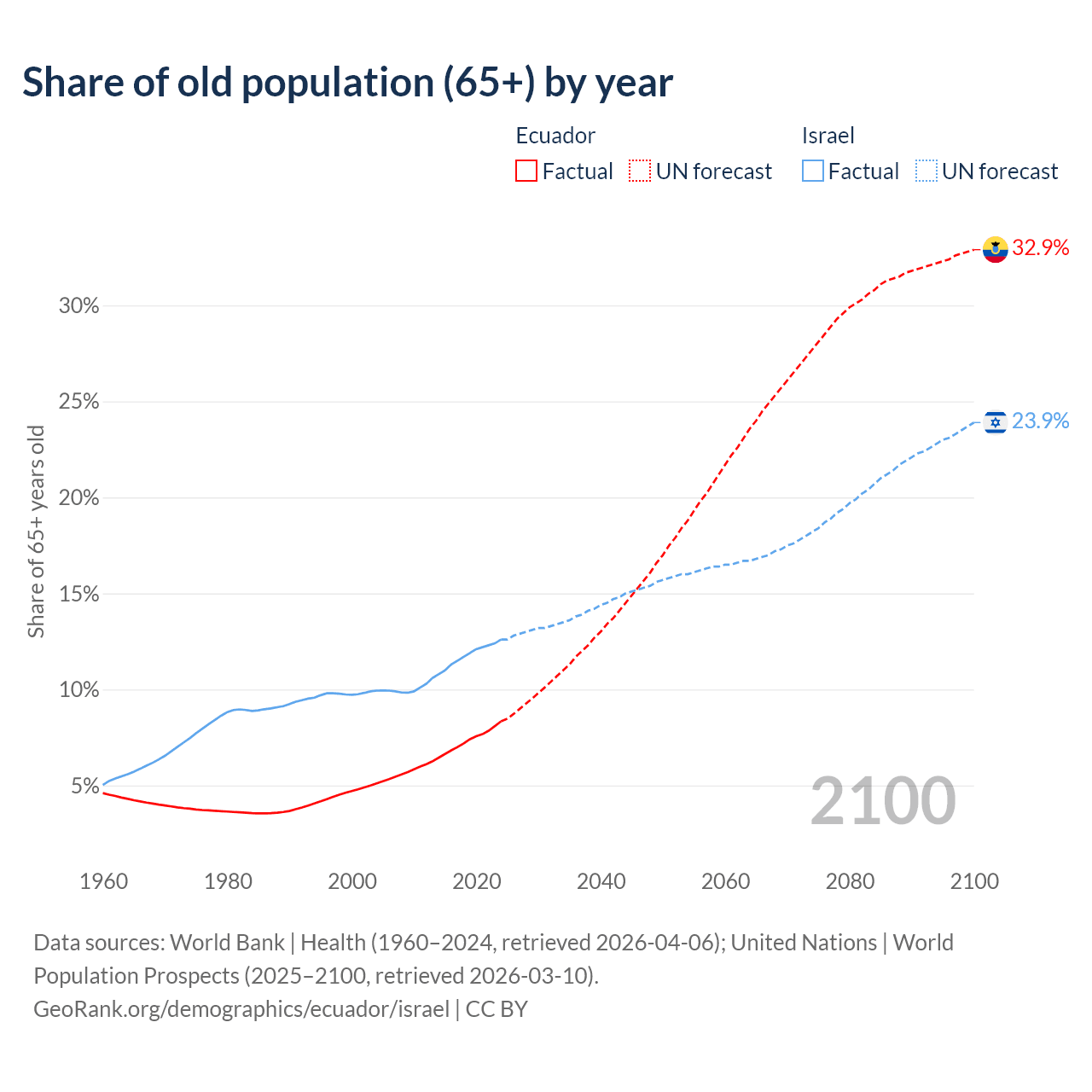 The share of older people aged 65 and over is 8.34% in Ecuador and 12.6% in Israel. Life expectancy in Ecuador compared to Israel .