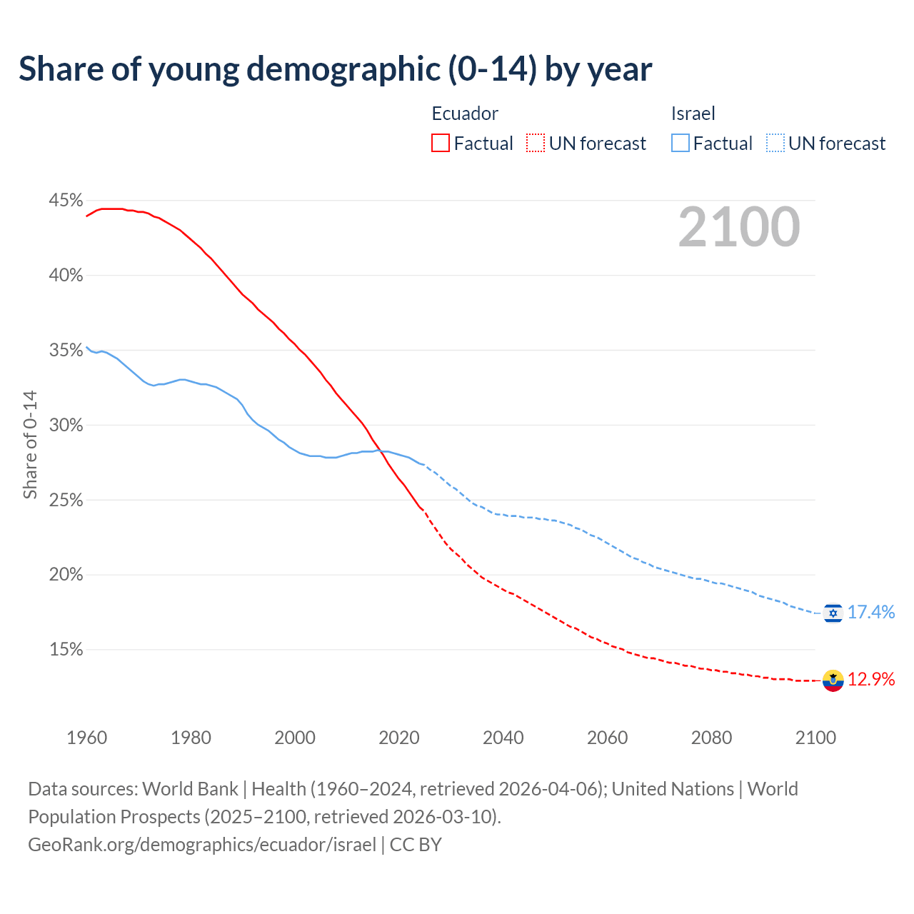 - The share of young demographic (0-15 years old) in Ecuador is 24.5% vs 27.4% in Israel.