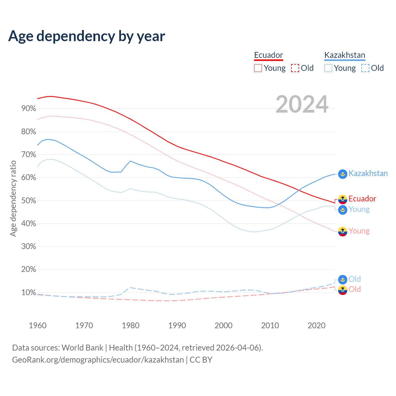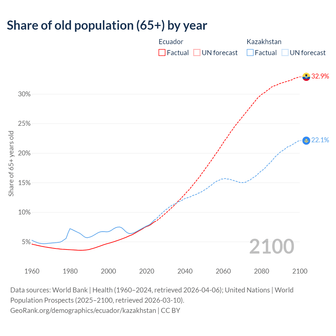 - The share of old-age demographic (65+) in Ecuador is 8.34% vs 8.65% in Kazakhstan.
