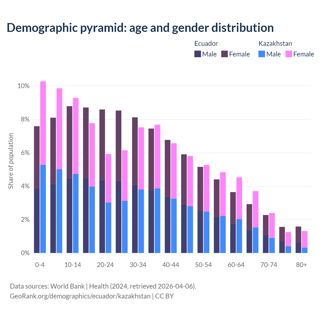- Ecuador is ranked 105/196 by median age (oldest to youngest) vs 99/196 for Kazakhstan.