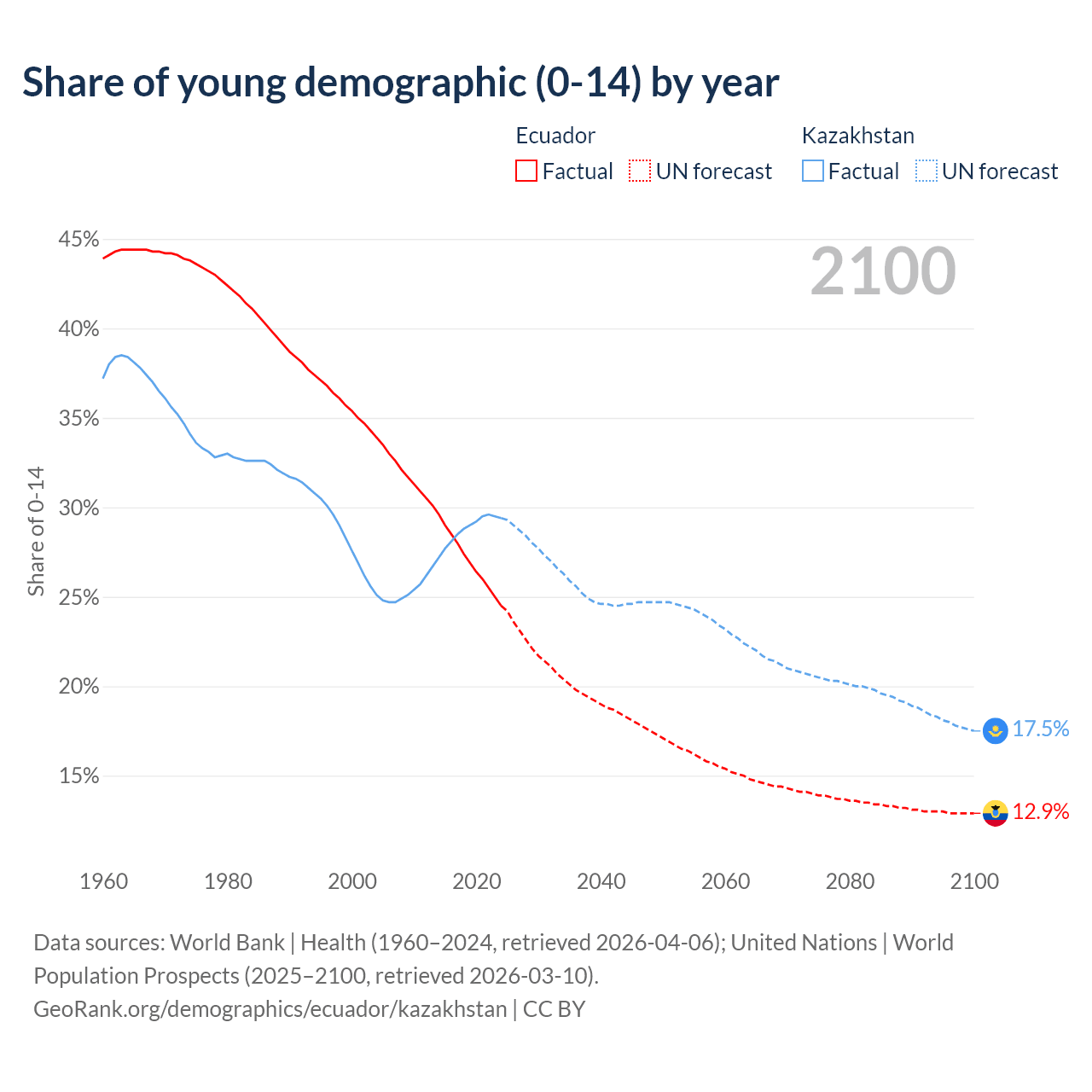 - The share of young demographic (0-15 years old) in Ecuador is 24.5% vs 29.4% in Kazakhstan.