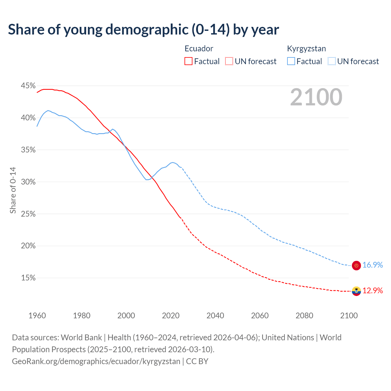 - The share of young demographic (0-15 years old) in Ecuador is 24.5% vs 32.3% in Kyrgyzstan.